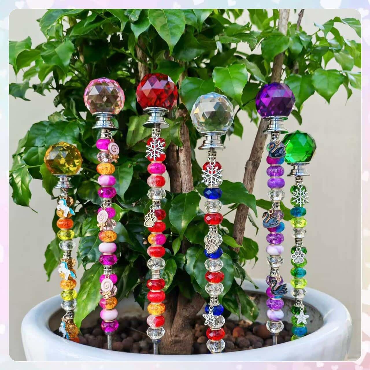 Customers find these garden stakes beautiful, adding sparkle to their plants, and appreciate them as a fun and easy craft project. They are simple to assemble, and one customer notes they come with a nice variety of beads and accessories.