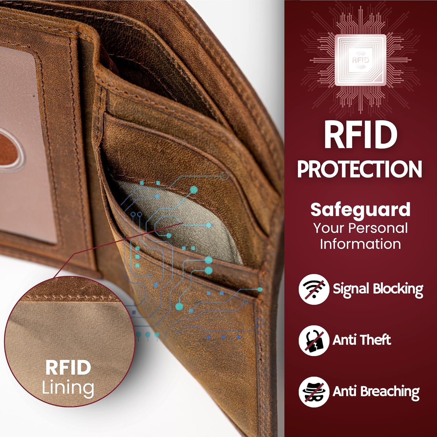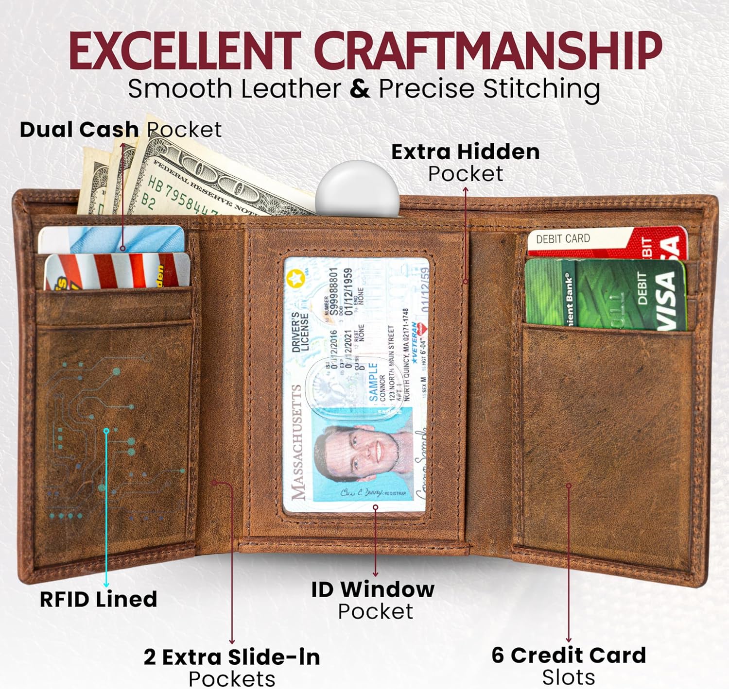 Smart Design: Our trifold wallet for men features easy to use & carry design with an impressive storage capacity: 1 Id compartment, a divider money section with 2 bill pockets, 2 slip in pockets and slots for 6 cards and 1 secret pocket for discrete hiding. Items and Id cards will be out of the prying eyes but easily accessible when needed. Crafted for efficiency and high capacity, you’ll never want to use another wallet or money clip again