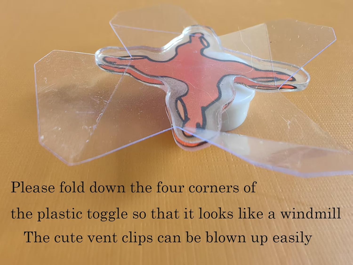 TIPS:Please fold down the four corners of the plastic toggle so that it looks like a windmill, so that the cute vent clip can be blown up easily