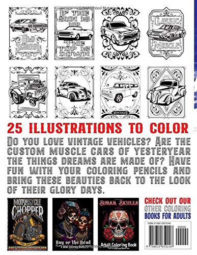 Work Out The Stress With Coloring Pages. Vintage and Muscle Car lovers and enthusiasts can sit down and pull out their coloring pencils while they drain those daily frustrations and create their own work of art.Original Illustrations. We’ve included 25 images so you can be as creative a you like. Single-sided Images. Each image is on its own page to reduce bleed-through.Makes a Wonderful Gift for Birthdays, Holidays or other gift-giving occasion.