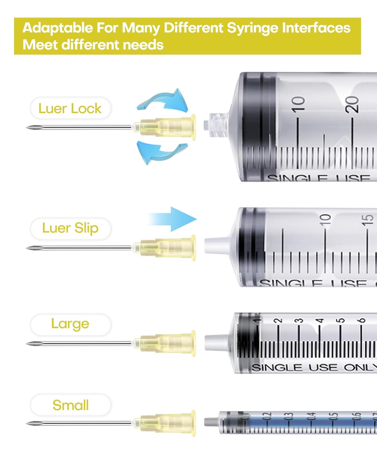 Luer Lock Design: Designed for use with both straight and threaded openings, Easy to use.