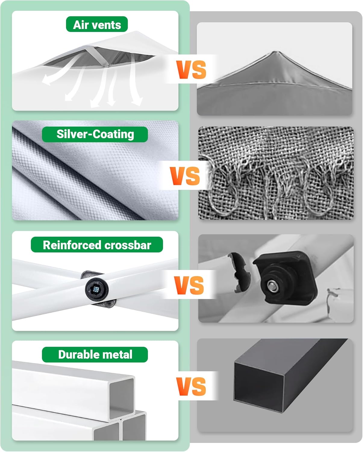 【Packing List & One Year Warranty】The package includes:1 canopy frame, 1 canopy top, 4 ropes, 4 canopy weights , 8 pegs and 1 Newly-designed storage wheel-bag.If this 10×10 pop up canopy doesn’t meet the needs of your outdoor experience, we offer excellent after sales service and are committed to resolving any issues or answering any questions you may have.