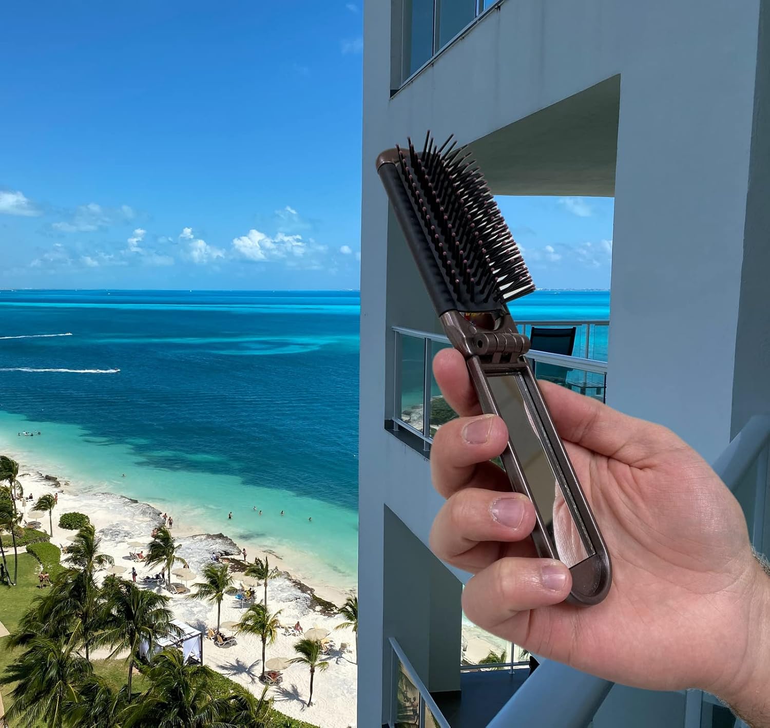 Space-saving full size hair brush folds down to mini size, great for purse, briefcase or pocket