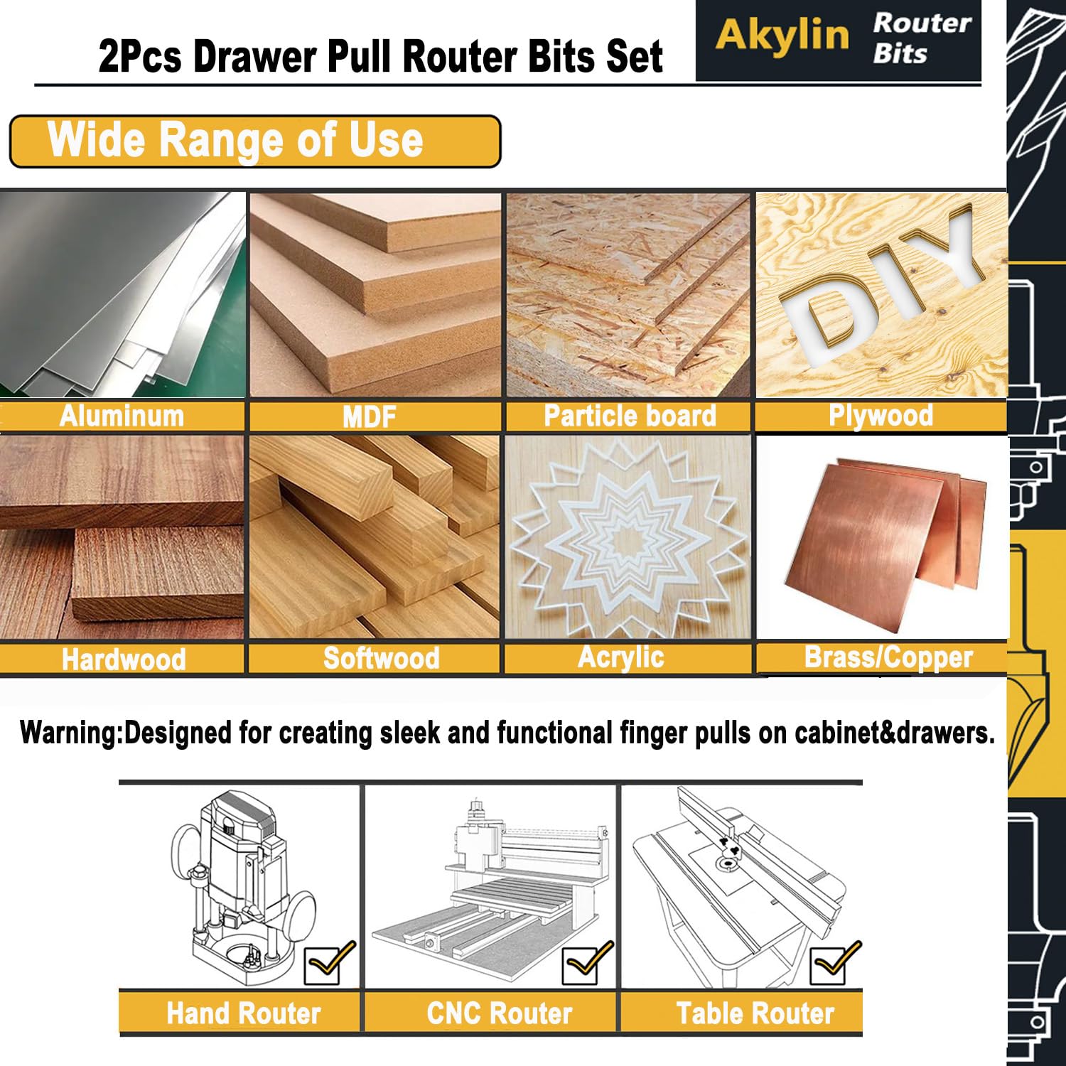 Upgrade your cabinet drawer making with our 1/2 shank finger pull router bits set! Designed specifically for making drawer pulls, our router bits make it easy to create sleek and functional handles that will elevate the look of any cabinet. Featuring welded carbide blades, our router bits cut quickly and smoothly, providing a professional-looking surface every time. And with its 1/2 shank, our router bits are compatible with most standard routers, making them a versatile addition to any woodworking toolkit. Whether you’re a professional woodworker or a DIY enthusiast, our finger pull router bits set is the perfect tool for creating custom cabinet handles.
