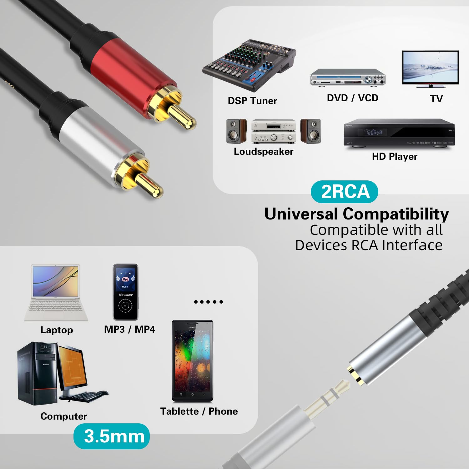 【Wide Compatibility】:This RCA to Aux Cable is ideal for connecting smartphones, MP3 player, Tablet to Stereo Receiver, or Home Theater, HDTV, Gaming Consoles, Hi-Fi Systems, VCR, DVD player, video camera, AV receiver, amplifier, projector, Subwoofer and more.