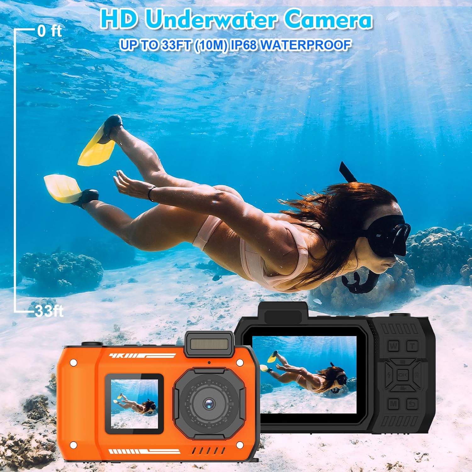33FT/10M Underwater Camera 4K 48MP Waterproof Camera with 32GB Card Dual-Screen Rugged Dustproof Shockproof Autofocus Selfie Digital Camera for Snorkeling Diving Sport Travel (Orange)