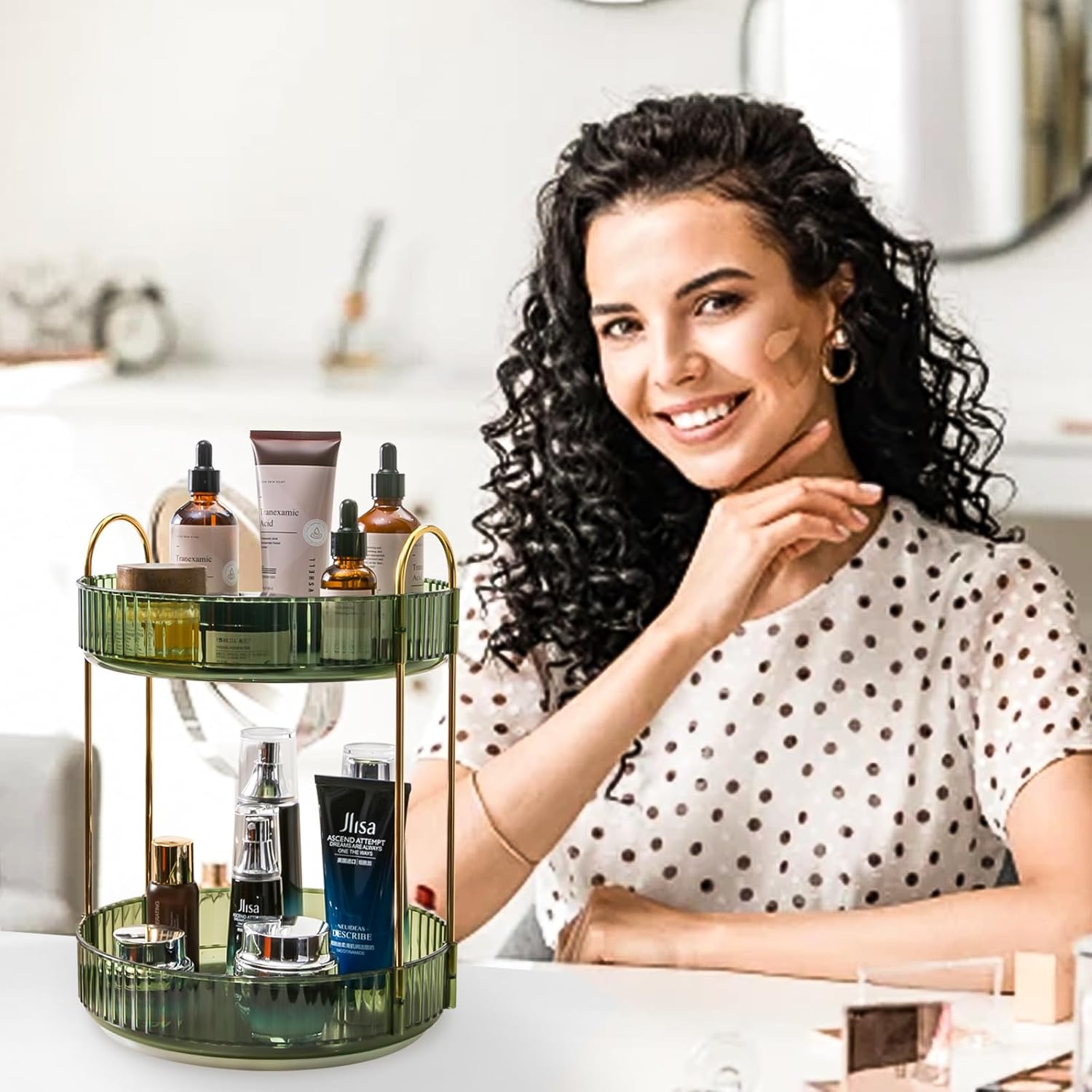 360 Rotating Design: It can easily rotate 360 degrees, and its rotating base and high tray edge prevent spills The skincare organizers boasts a large capacity make up organizers and storage with the added convenience everything is easily accessible and within arm’s reach with just a simple spin.