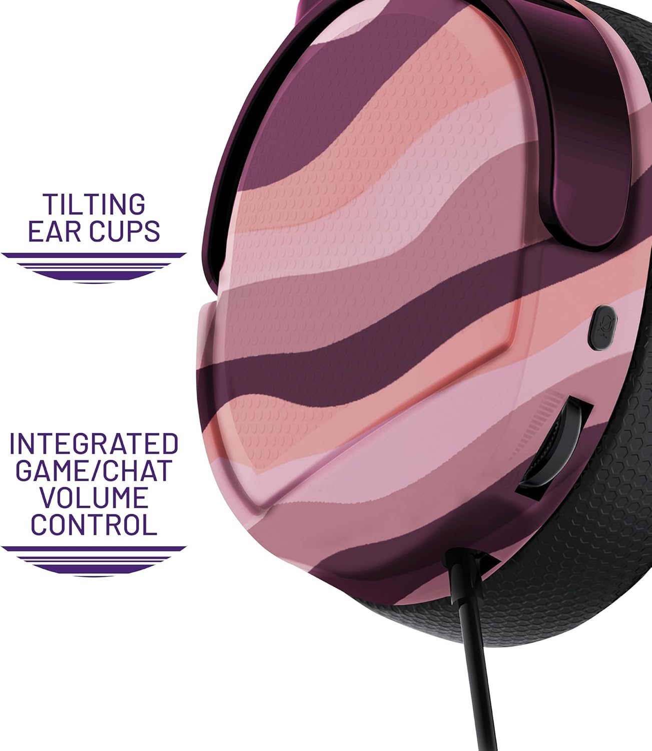 A multi-platform Gaming Headset. Compatible with PS4, PS5, Xbox One, Series S, Series X, Nintendo Switch, PC and mobile devices. It has a lightweight, comfortable design with soft-foam, breathable mesh ear cushions, flexible mic and adjustable, padded headband. The premium speakers with Air-Flow Chambers and pin-point mic are designed for immersive game audio and clear chat during gaming sessions. Integrated, on-headset controls make adjusting game audio and chat volume easy. With 3.5mm jack connection, volume control and mute, controlling your gaming experience has never been easier. Matte blossom pink finish with undulating wave effect soft-touch earcups.