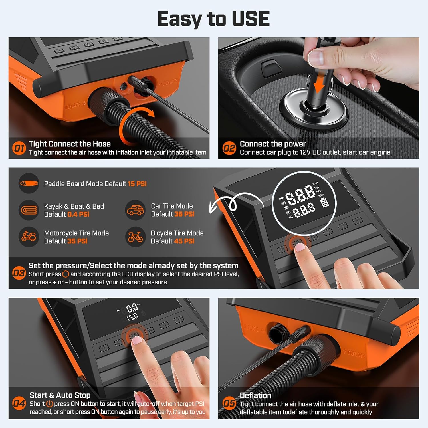 【5 Preset Modes & Custom PSI Adjustment for Ultimate Versatility】This electric SUP pump offers 5 preset modes: Paddle Boards/SUP (15 PSI), Kayak/Boat/Bed (0.4 PSI), Car Tire (36 PSI), Motorcycle Tire (35 PSI), and Bicycle Tire(45 PSI). It also allows manual PSI adjustment for customized inflation, easily adjust settings using the “+” and “-” buttons, and keep track of real-time pressure readings for precise control and efficient operation