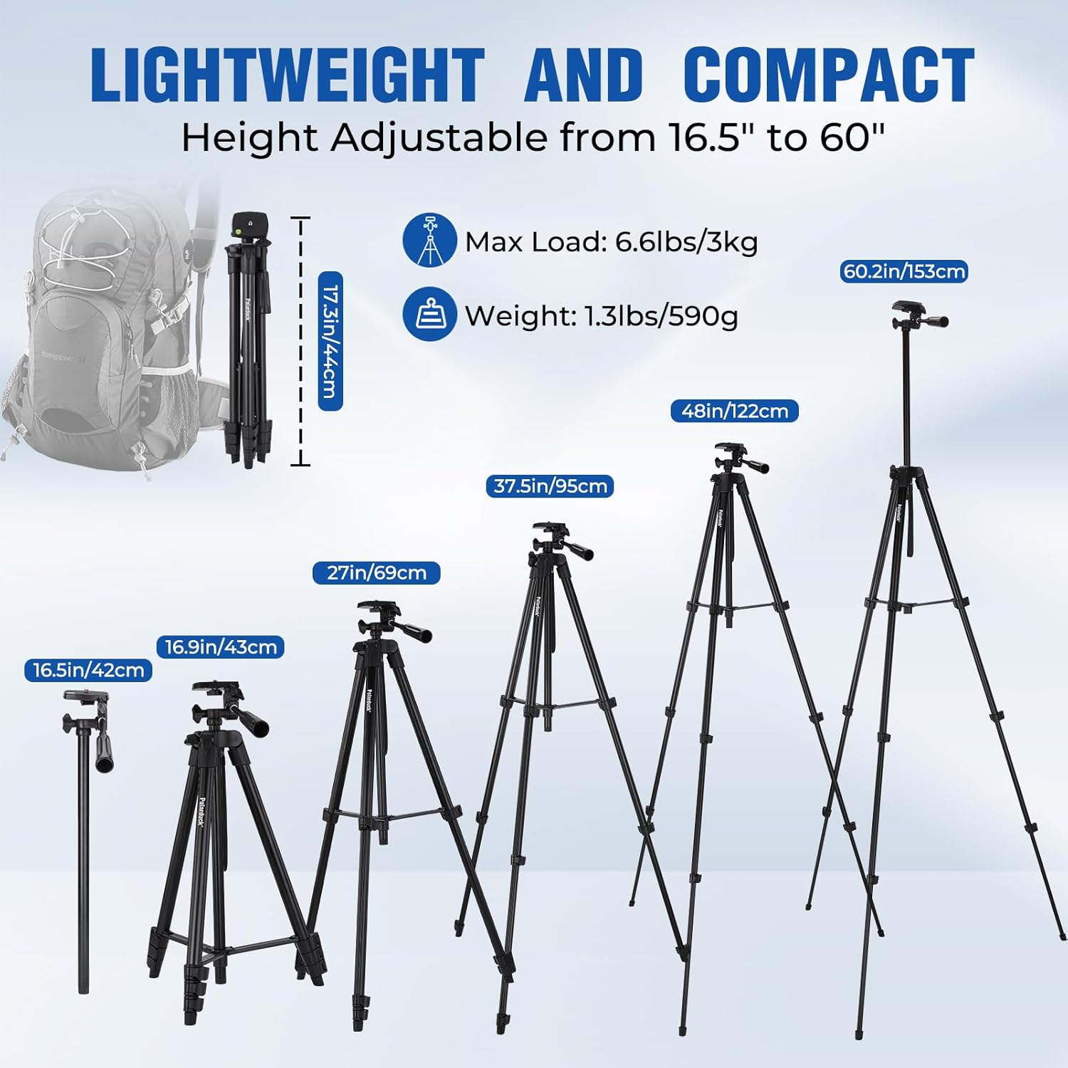 HEAVY DUTY & STURDY: 3-section, quick release lever-lock legs for easy height adjustment, 16.9 inches to 60 inches. This camera tripod can meet various shoot environments and photographic needs, perfect for taking it with you on travel. Essential for your trip.