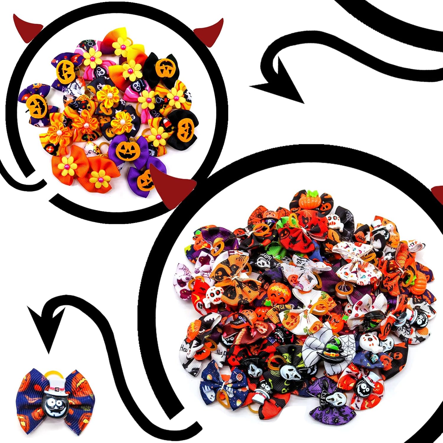 80 x halloween small dog bows, there is 2 kinds of the same so a pair of each. Very durable and super cute & classy, they stay in really well and they are also easy to remove and don’t cause any damage.