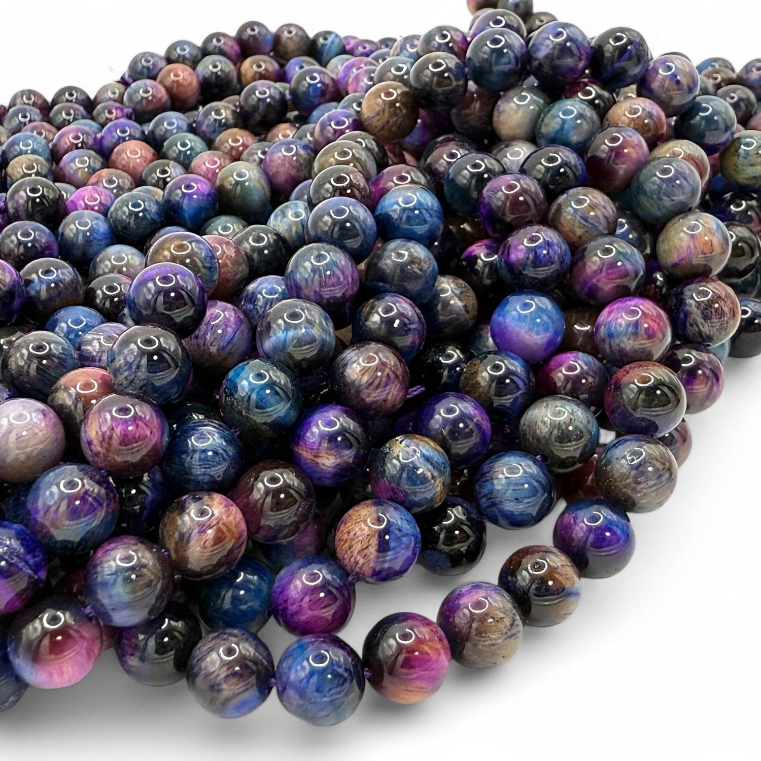 Each bead boasts a unique mix of shades, creating a cosmic, galaxy-like appearance. The heat-treated finish enriches the natural colors, giving each strand a one-of-a-kind celestial glow.