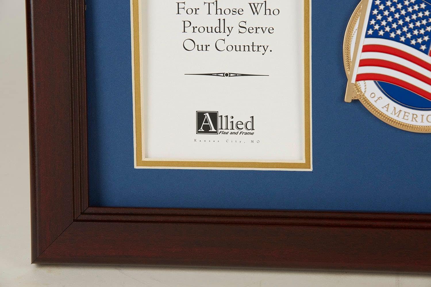 Allied Frame’s unique mahogany colored wooden frame exhibits a die-cast U.S. Flag medallion centered between two 4-Inch by 6-Inch vertical photo openings. These gold trimmed photo openings are perfect for proudly displaying the photo of a patriotic family member who has served our country in some capacity. The outside dimensions of the frame are 8-Inch by 16-Inch, and it comes complete with desktop easel and wall mounting hardware.