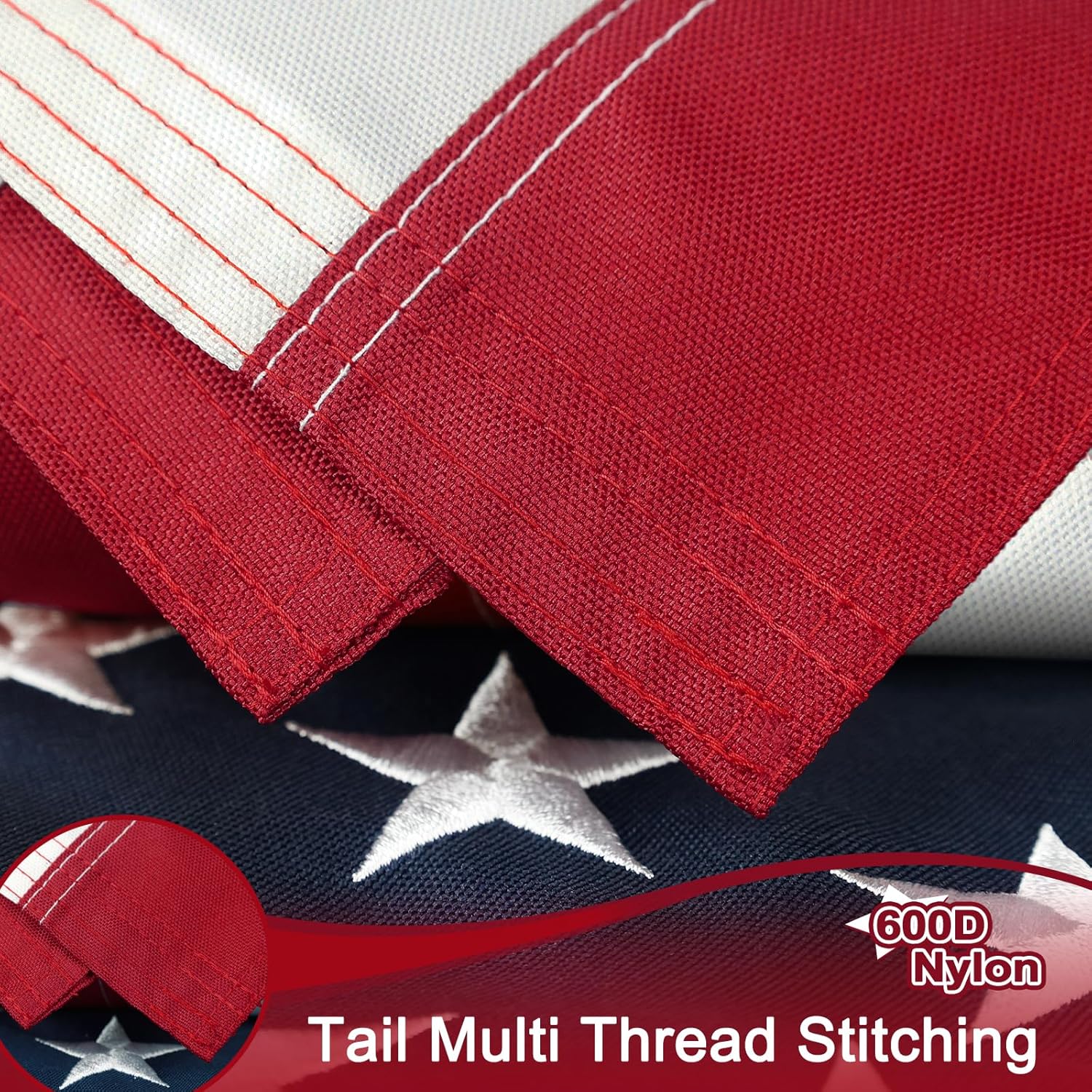 【Deluxe Embroidered Stars & Thicken Stripes】3×5 ft American Flag 600D outdoor heavy duty consists of 50 densely embroidered stars and 13 thickened double-stitched stripes. All the edges of the USA flag are double-sewn, and the placket hem has 4 rows of reinforcement and is well made to prevent rapid tearing and wear and fraying, increasing the longevity of the 600D US flag.