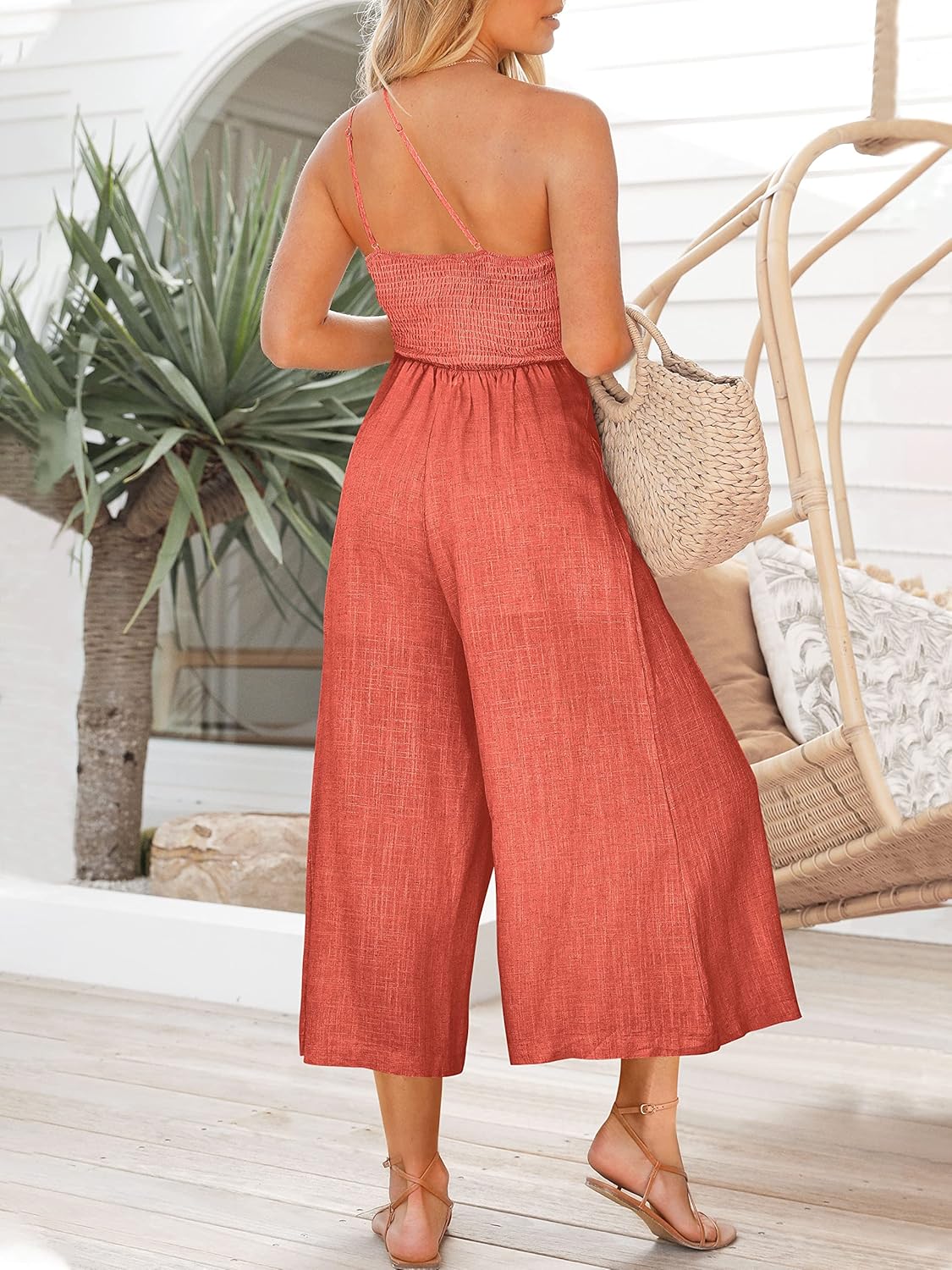 ANRABESS Women’s Summer Straps One Shoulder High Waist Dressy Casual Wide Leg Linen Jumpsuit Romper Beach Travel Outfits