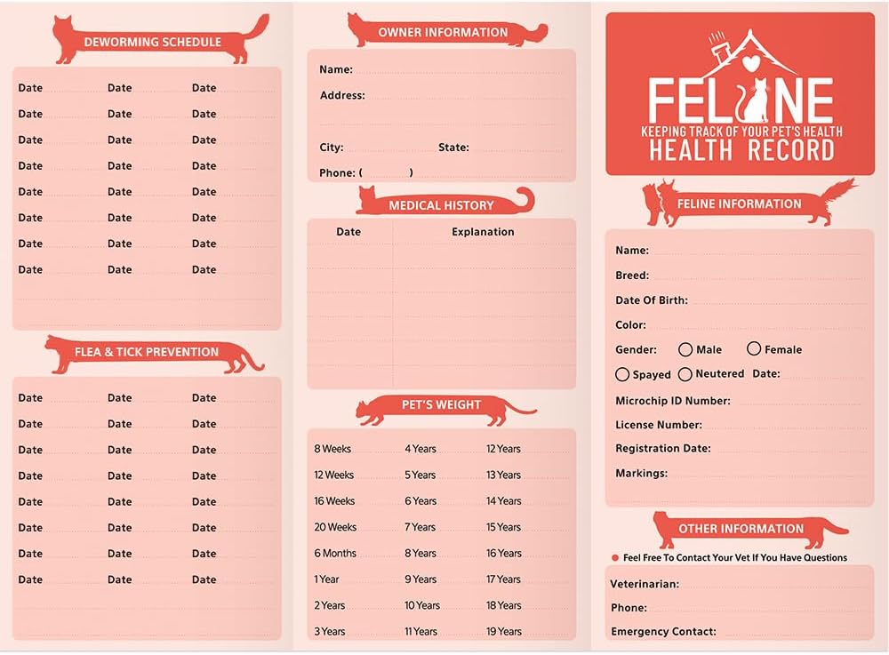 [Function] The 24 Bulk Pack Kitten record is suitable for vet offices, breeders, and pet owners to track feline immunization records, deworming schedules, weight logs, vet appointments, medical history, and pet information (breed, age, gender, owner contact).