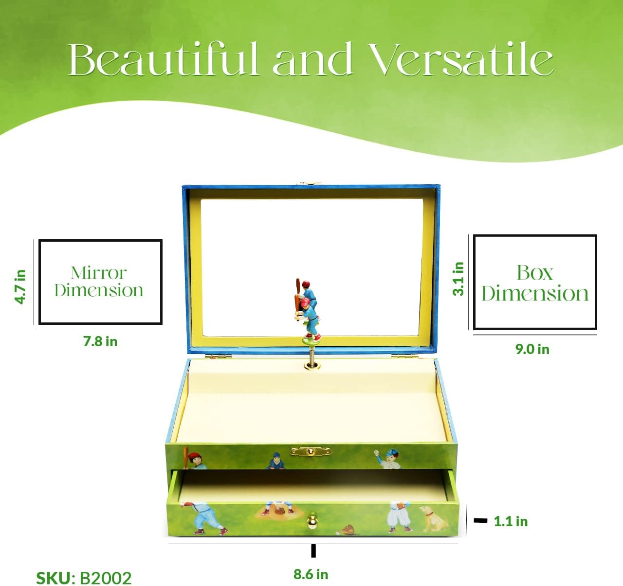 ✨ MULTI-FUNCTION: Not just a beautiful music box, this enchanting item contains multiple drawers to store trinkets and keepsakes, seamlessly combining aesthetic allure and practical functionality. Our musical baseball box has 1 big compartment that provides ample space to store all precious treasures in one place, creating a safe home for memories to be kept. You’re not just giving a music box – you are encouraging organizational skills that any child will hold onto for years to come.