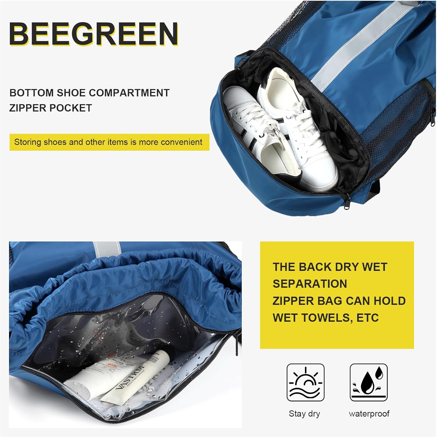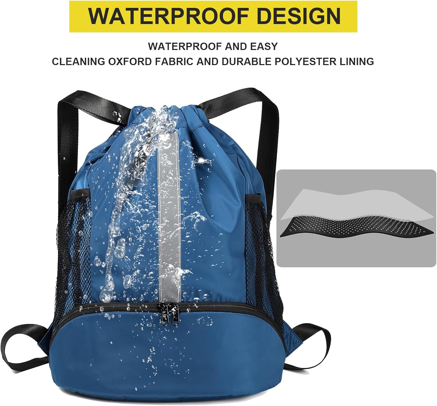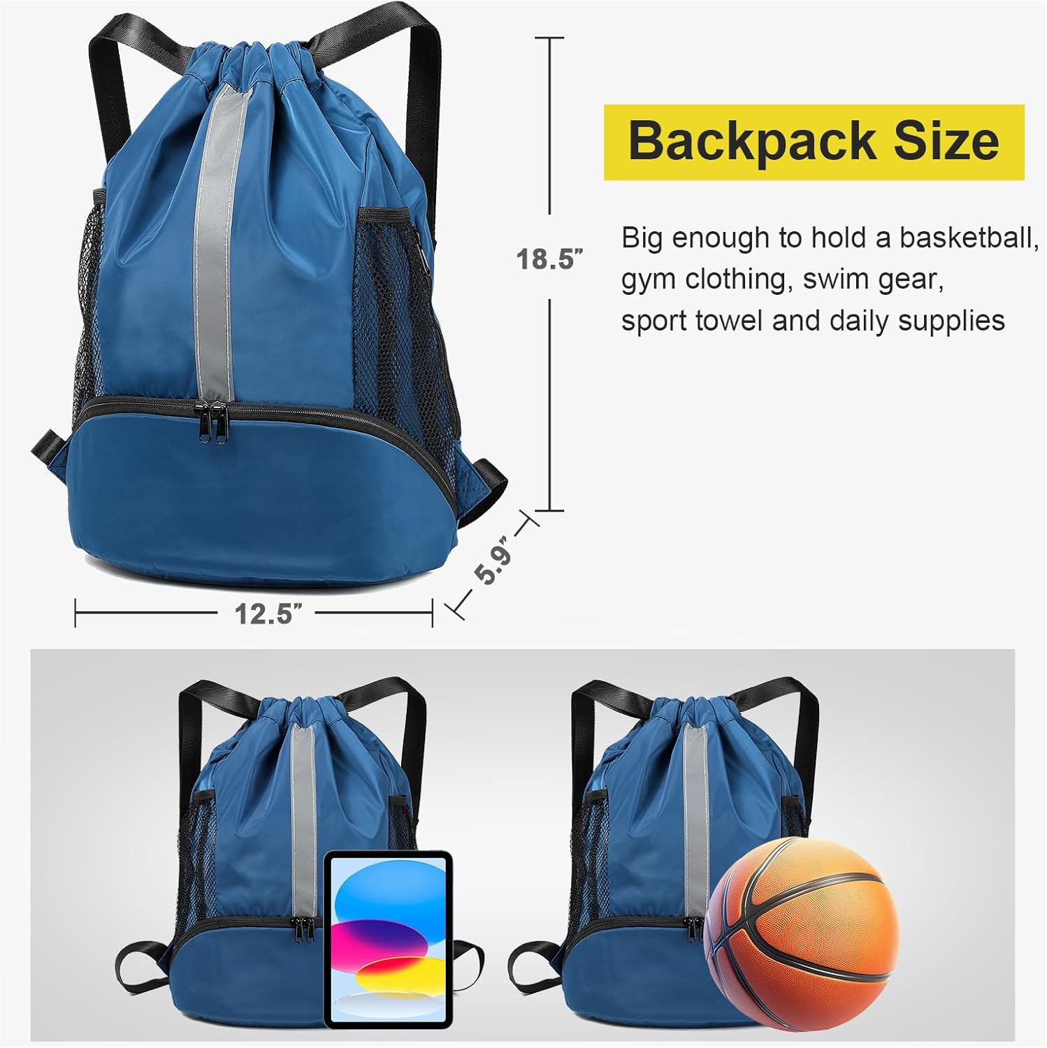 SEPARATE WET POCKET & SHOE COMPARTMENTS: This drawstring bag has a wet pocket on backside for storing damp items like toiletries and wet towels, keeping other items dry and organized. And there is an enlarged shoe pocket at the bottom, which is perfect for storing sneakers or high-top basketball shoes.