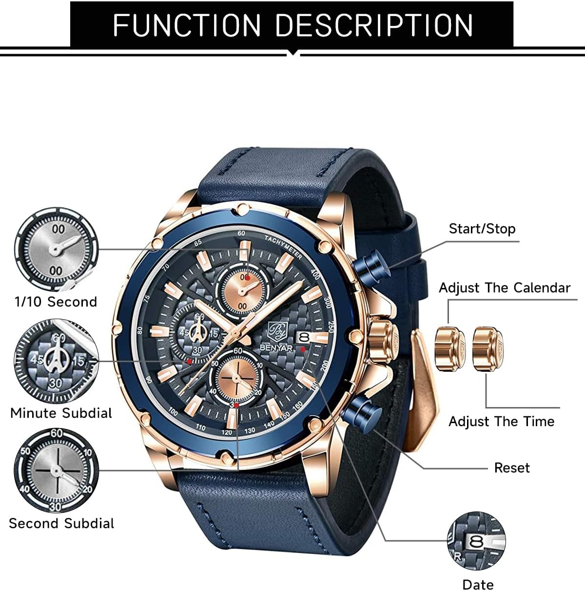 BENYAR Mens Watch Analog Quartz Movement Chronograph Leather Strap Waterproof Luminous Date Wristwatch Stylish Casual Business Wrist Watches Elegant Gift for Men