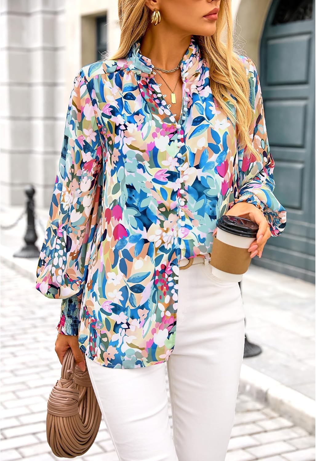 Customers like the blouse’s colors, with one mentioning it pairs well with white skinny or straight jeans. The fit receives positive feedback, with customers finding it beautiful and comfortable.