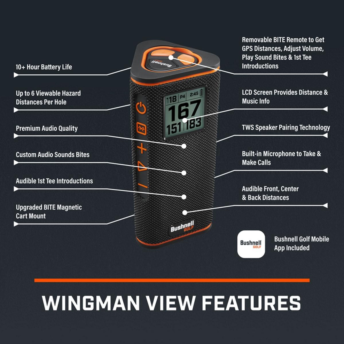 Bushnell Golf Wingman View GPS Speaker | LCD Screen, Magnetic Mount, Music & Audible Distances for 36,000+ Courses, Wireless Remote, 36-Hole Battery, Hazard Info, Signature Series Power Bundle