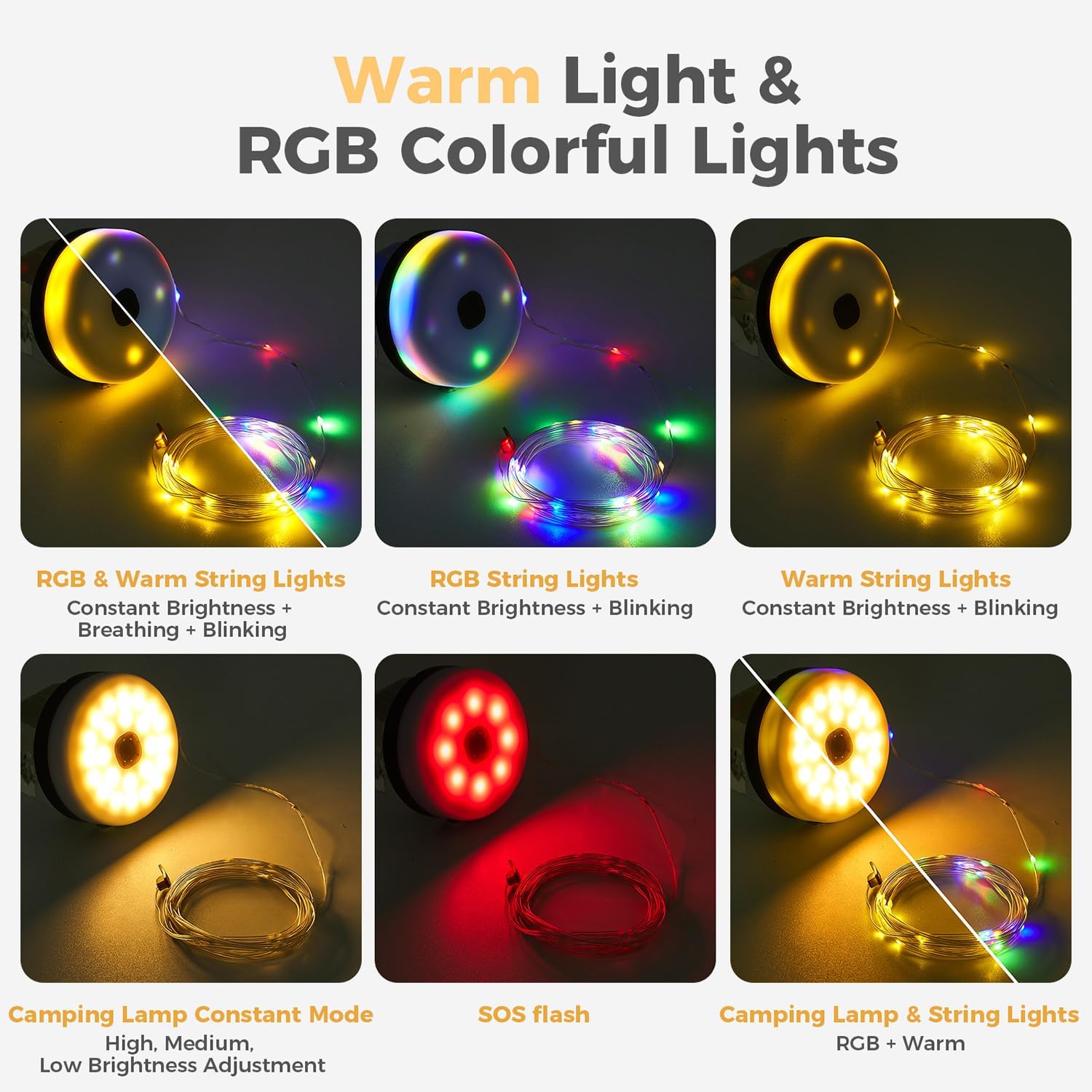 32.8 ft string lights with features warm colors and RGB. Cool color jumps, use it to bring you anunforgettable camping memory.