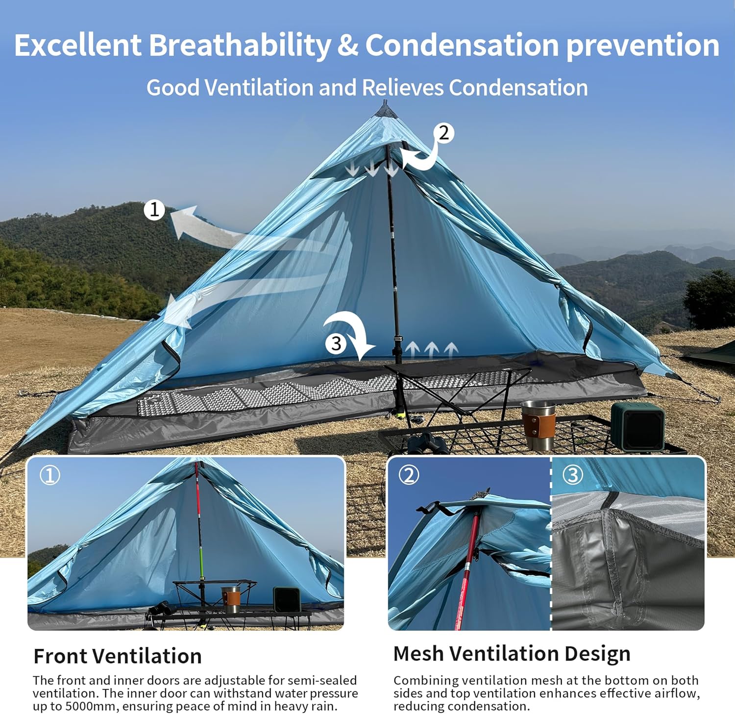 【Easy Setup】: The inner and outer tents are connected with stakes, eliminating the need for separate assembly. Reinforced with wind ropes and tent stakes, it can be set up in 5-10 minutes using a trekking pole (not included), saving time and effort.