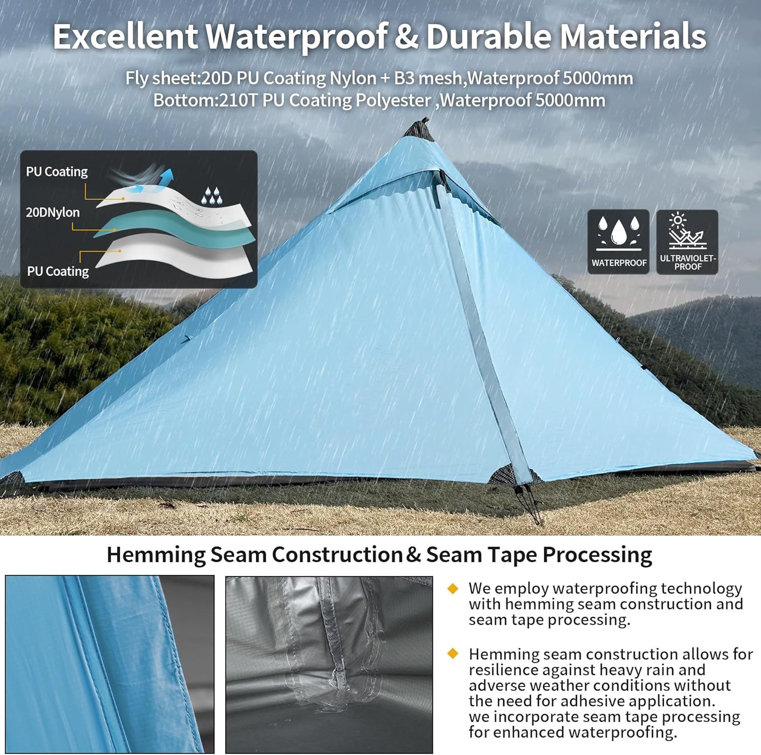【Material and Performance】: The flysheet is made of 20D nylon with B3 mesh, the bottom is made of 210T PU-coated polyester, both providing 5000mm waterproofing.The tent is lightweight yet strong, standing solid as a rock in windstorms, hail, and thunderstorms. It is also UV-resistant and tear-resistant.