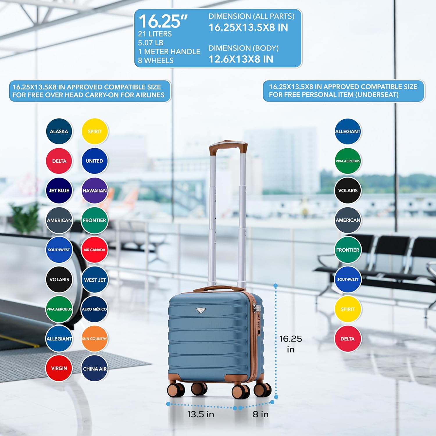 SIZES: Carry-On 16.25″ – Overall Dimensions: 16.25×13.5×8 Inches (Including Handles & Wheels), Packaging Dimensions: 12.6x13x8 Inches, Weight: 4.85 LB, Capacity: 21 Liters. So whether you’re flying for business or jetting off on your next adventure holiday this cabin bag will give you the most flexibility across your travels.