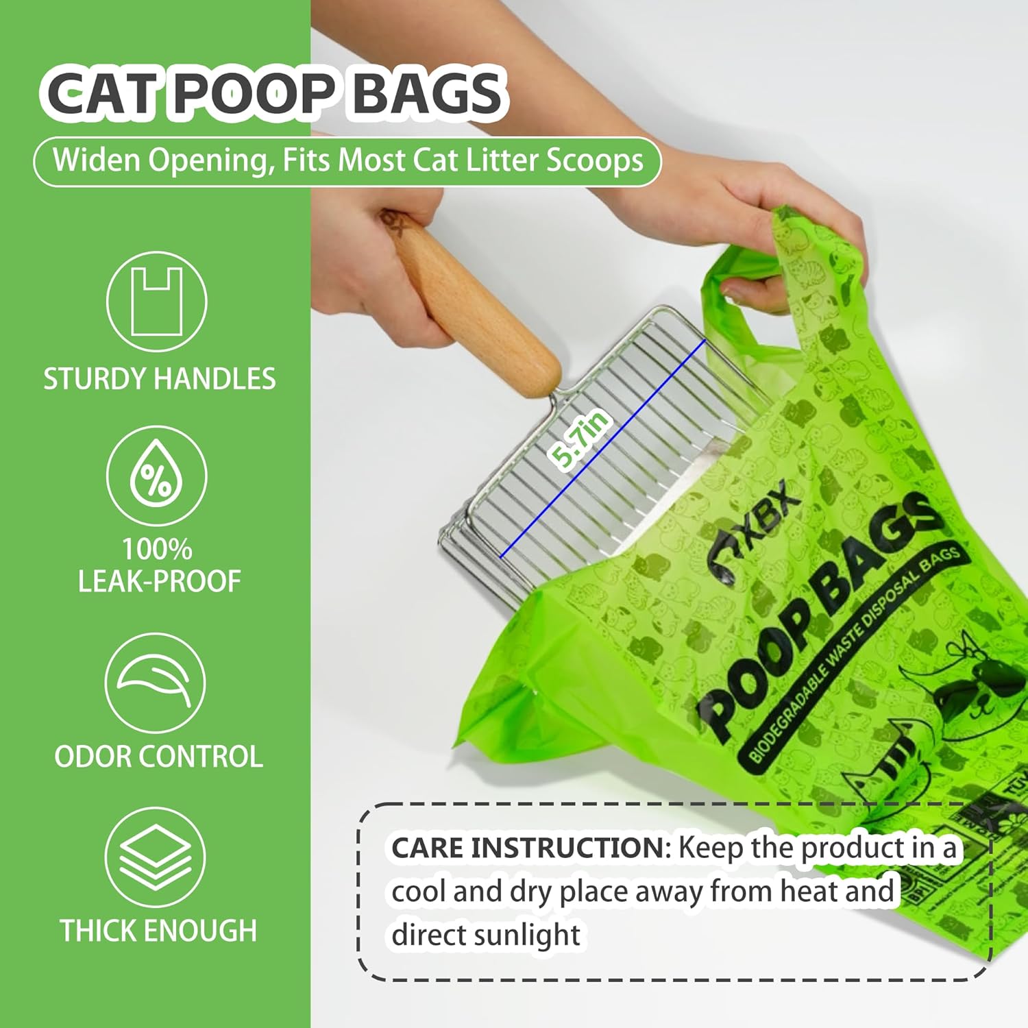 Sturdy and Leak-Proof: Engineered for strength, our cat poop bags are leak-proof and odor-proof, capable of securely holding up to 8 pounds of garbage. Once tied, these pet waste bags effectively seal in odors, making cleanup quick and effortless. Their sturdy design makes them the perfect choice for daily use