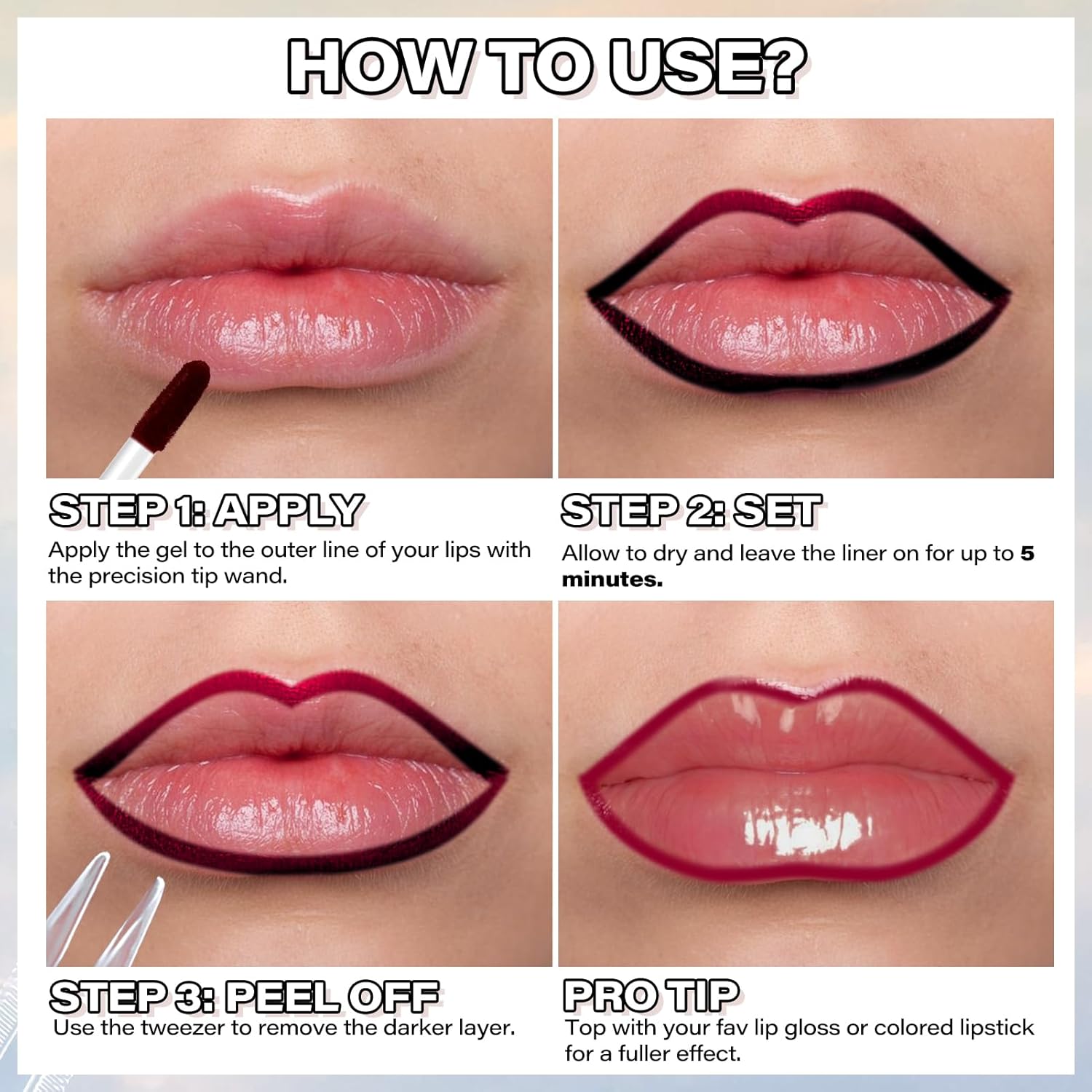 Long-wearing Lip Color: The gel formula that makes the lip liner virtually transfer-proof, water resistant and stays in place whatever your lips are up to. Just leave it up to 20 mins and peel off the darker layer.