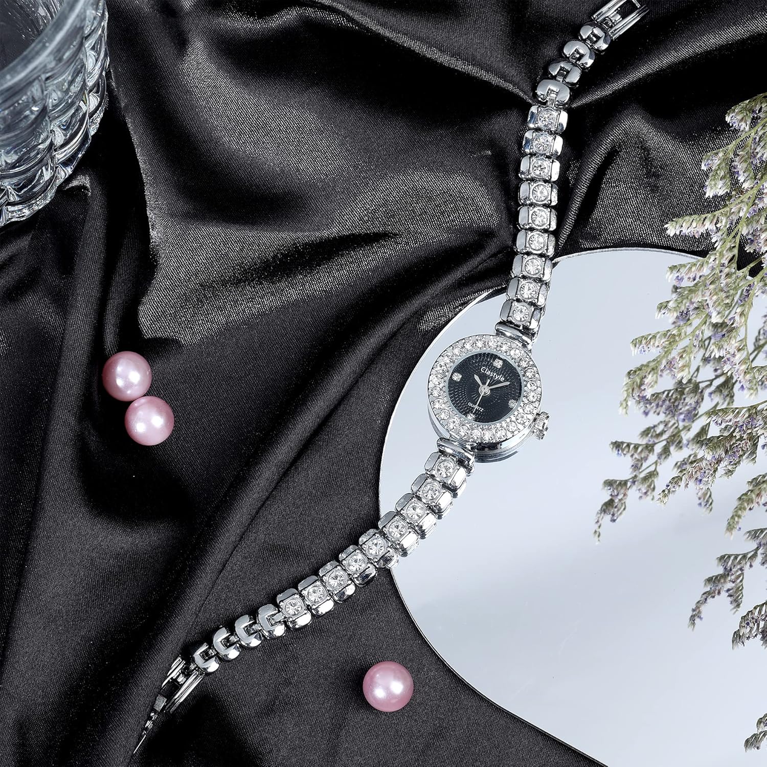Clastyle Stylish Silver Women Watches Tiny Dainty Ladies Wrist Watches Black Rhinestone Bracelet Watch Gifts for Her Mom