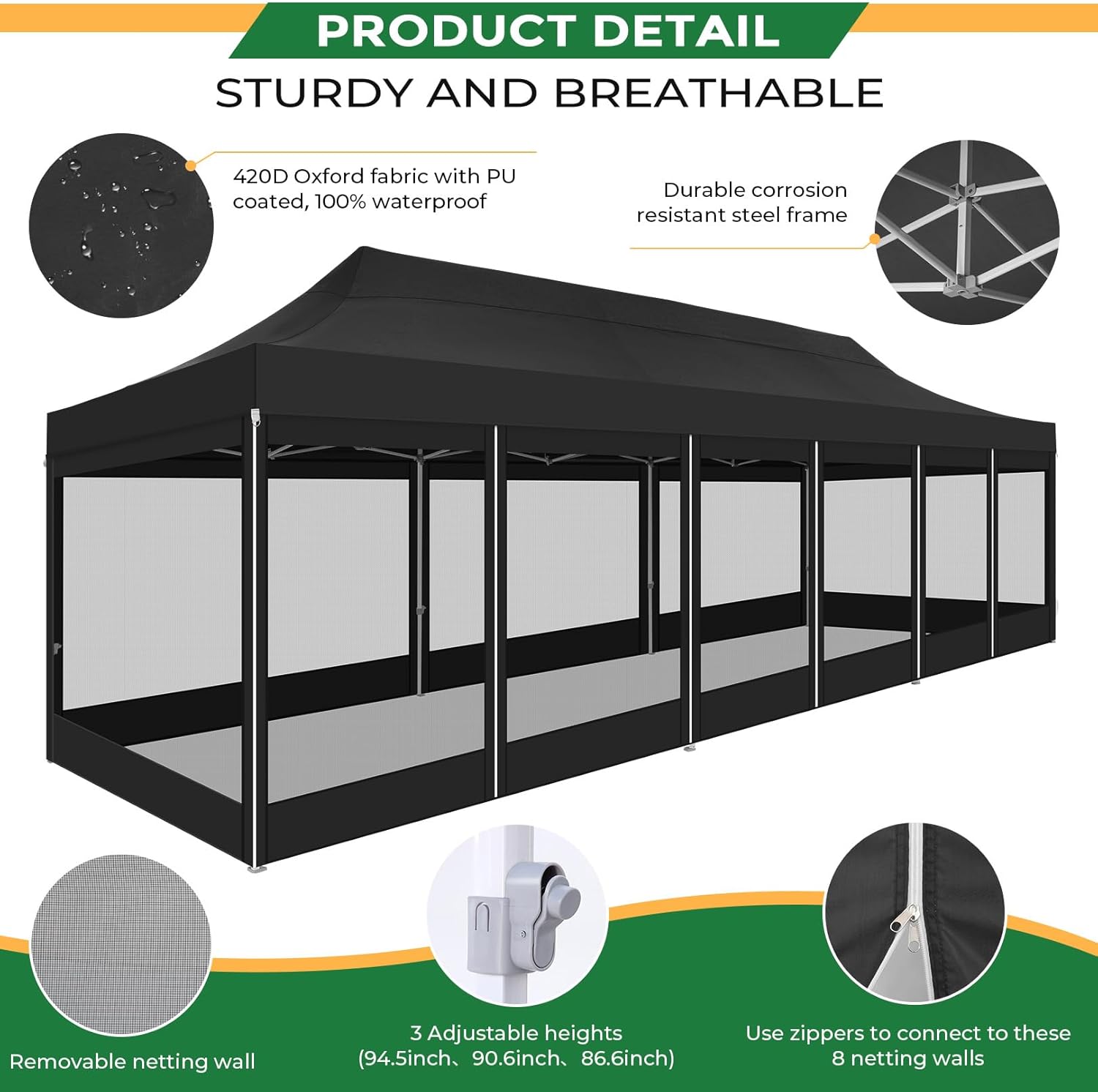 COBIZI 10×30 Heavy Duty Pop Up Canopy with 8 Sidewalls, Commercial Gazebo Party Tent with Mosquito Netting Wall Easy Set Up Outdoor Instant Screen Tent for Backyard, Patio, Garden, Black