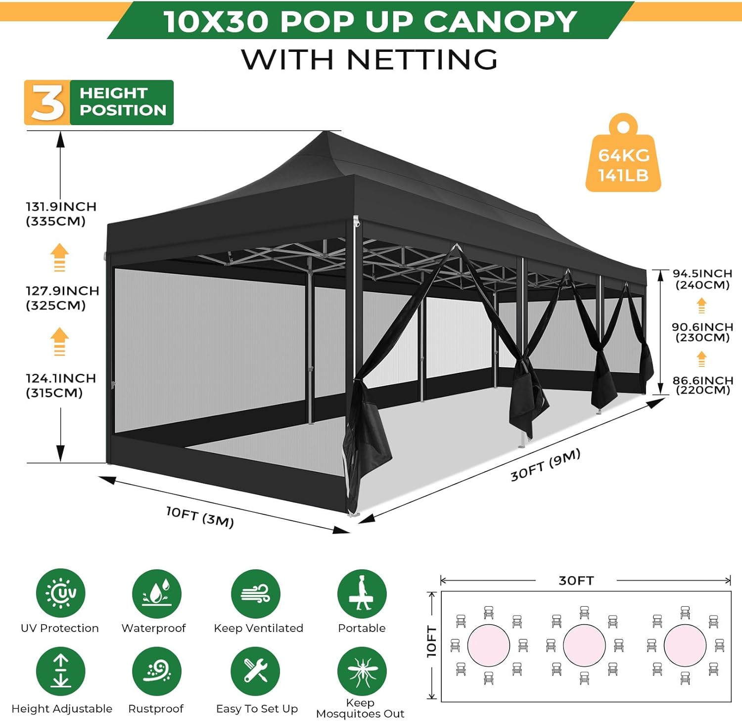 【Large Space】10×30 pop up canopy tent with netting provides a shade area of 300 square feet, enough to accommodate 25-30 people. For festivals, weddings, or parties, this 10×30 canopy tent with walls is a great choice.