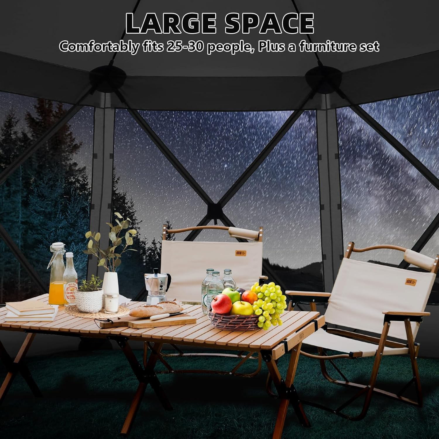 【Spacious and Comfortable】Our 15FT x 15FT camping tent has enough space for up to 25-30 people and furniture, with high ceilings providing plenty of headroom.
