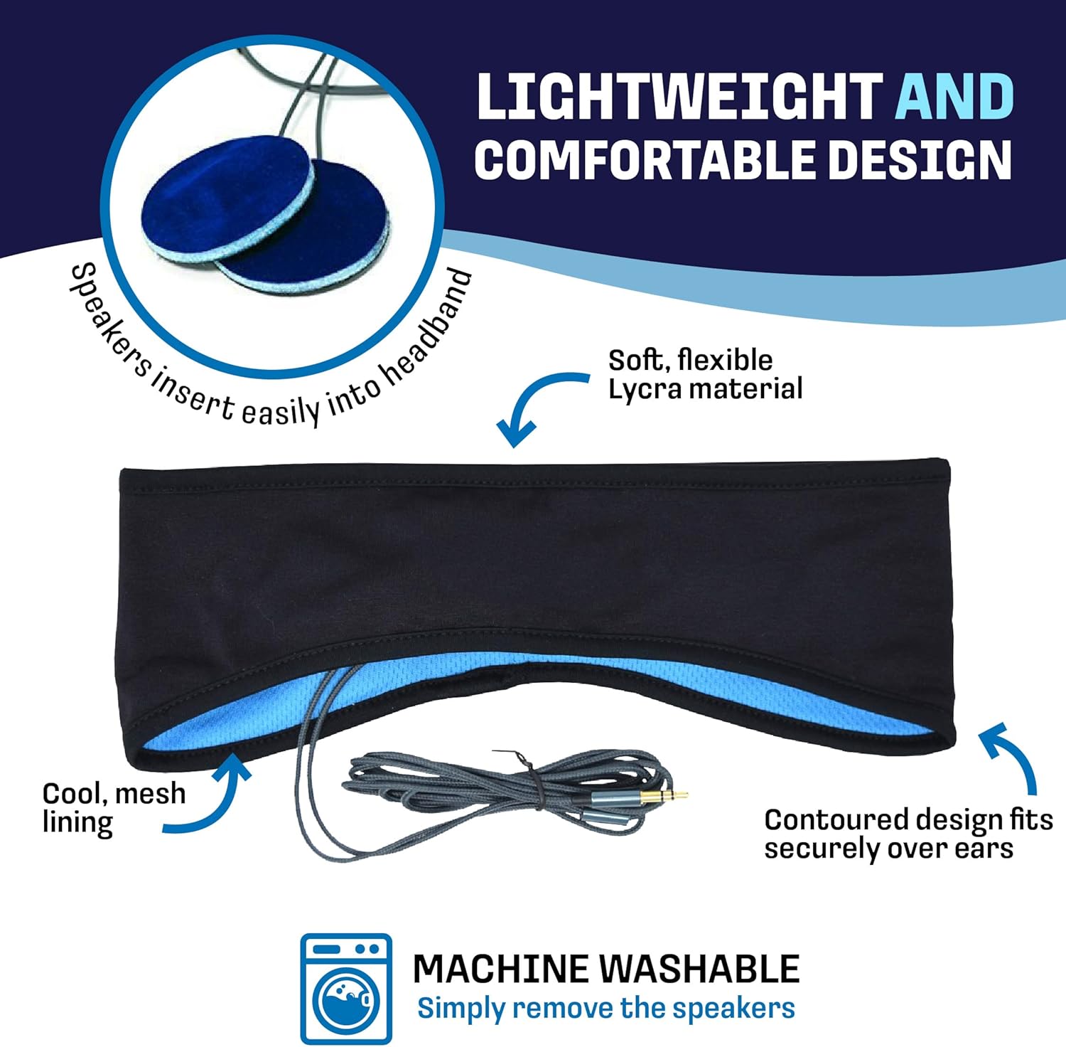 HEADBAND EARPHONES: Lightweight, comfortable and washable sleep headband features a contour shape that dips down over your ears to provide the perfect fit. Thin 1/8″ cushioned, removable speakers with a durable 52-inch cable provide rich, clear sound.