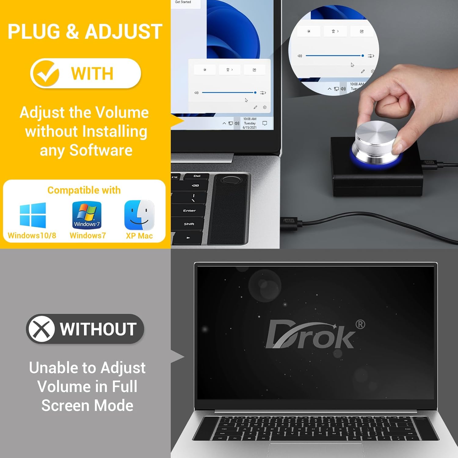 DROK USB Volume Control Knob – Computer Speaker External Volume Control with 1-Key Mute Function, Programmable, Compatible for PC/Mac/Android