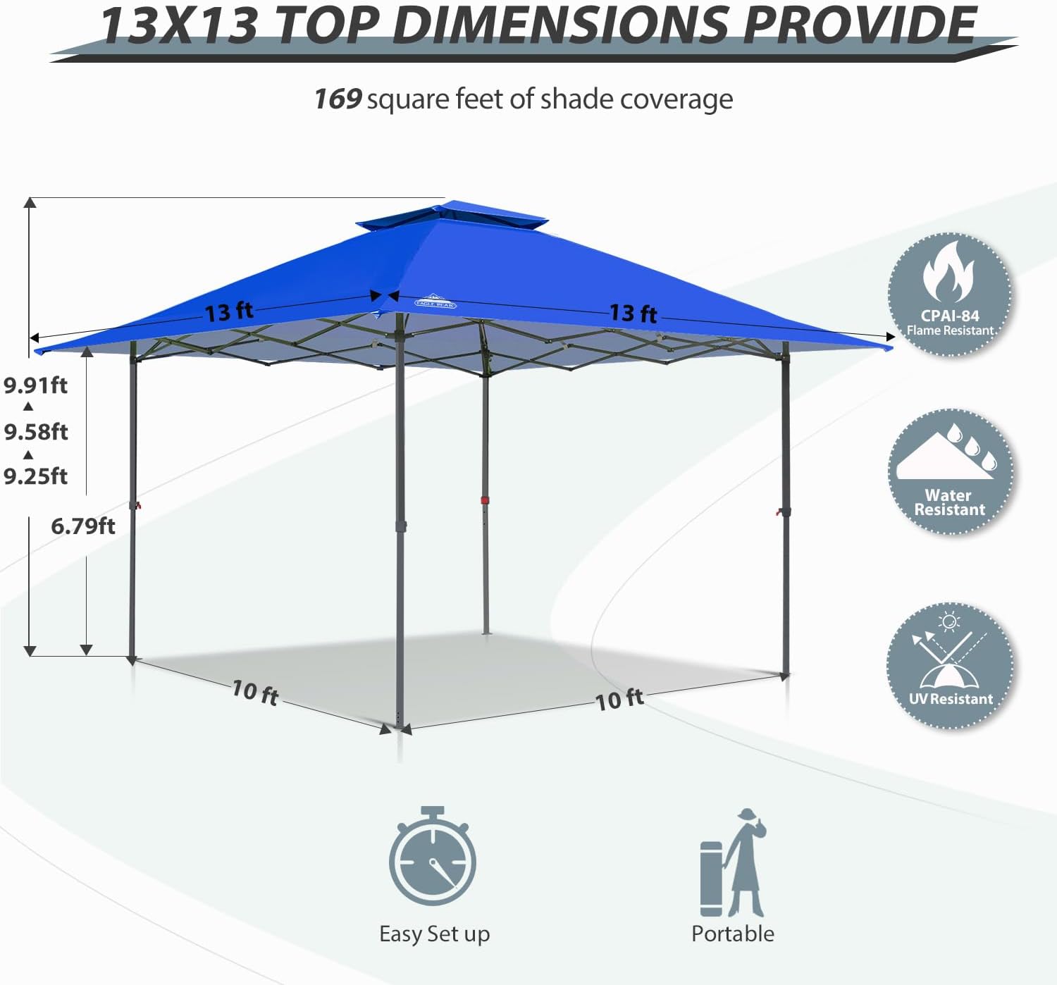 EAGLE PEAK 13×13 Straight Leg Pop Up Canopy Tent Instant Outdoor Canopy Easy Single Person Set up Folding Shelter w/Auto Extending Eaves 169 Square Feet of Shade (Blue)