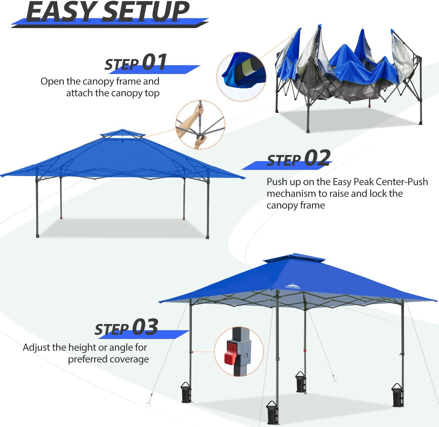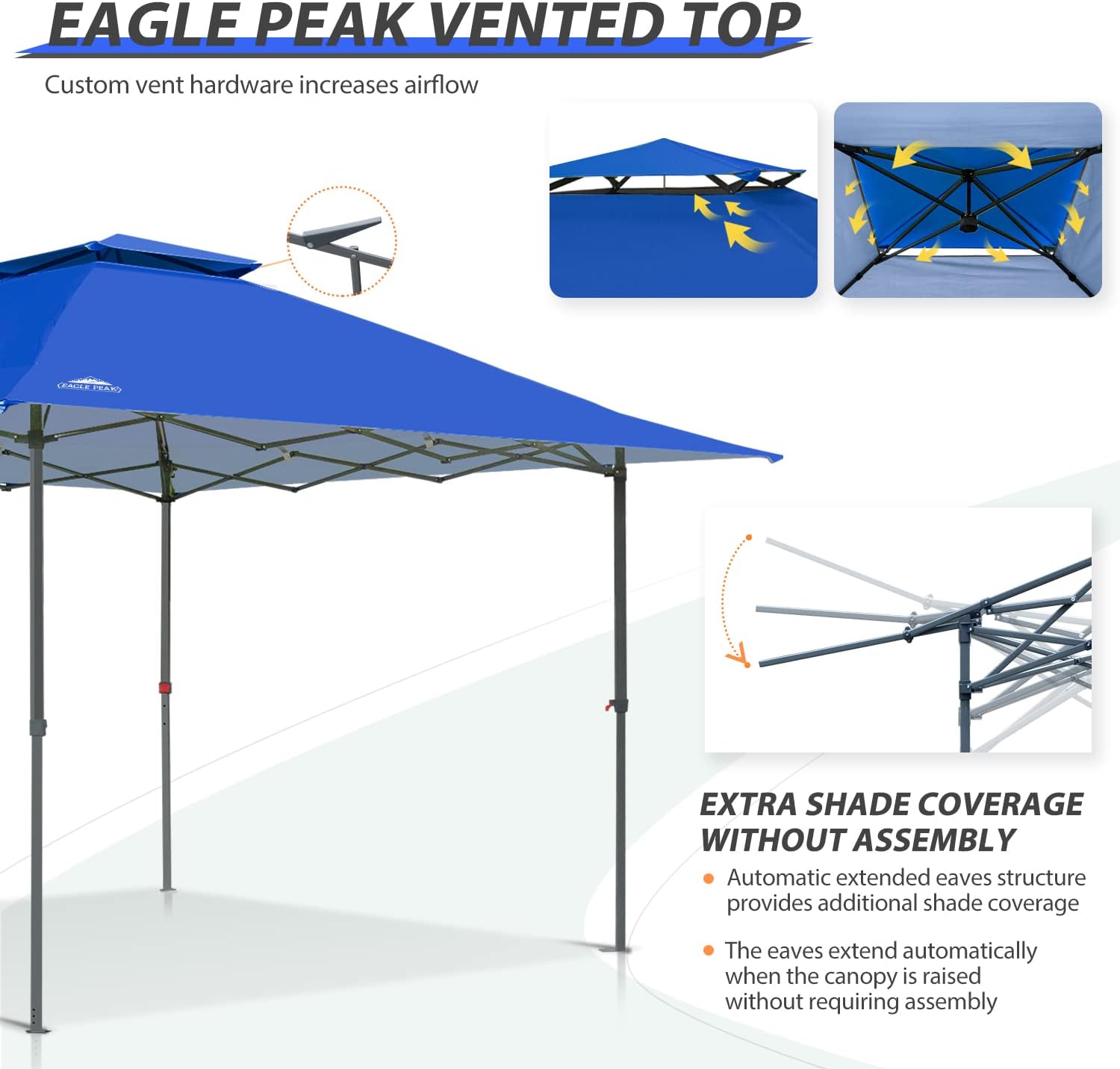 VENTED TOP & AUTOMATIC EXTENDED EAVES: Stay cool with the EAGLE PEAK VENT that allows for greater airflow while you work or relax. The canopy’s automatically extending eaves open without any manual assembly and, combined with a sturdy straight-leg design, provides maximum coverage so 8 or more people can enjoy the spacious 169 square feet of shade. The easily adjustable telescoping 3-position steel frame is perfect for adjusting the canopy for your preferred coverage