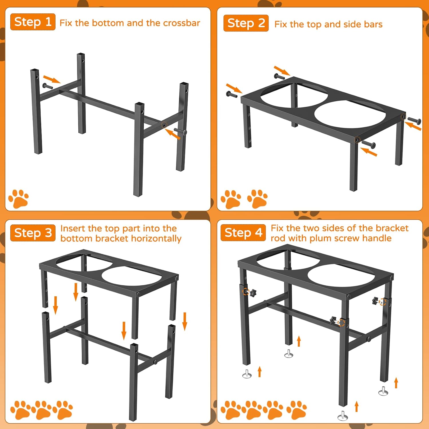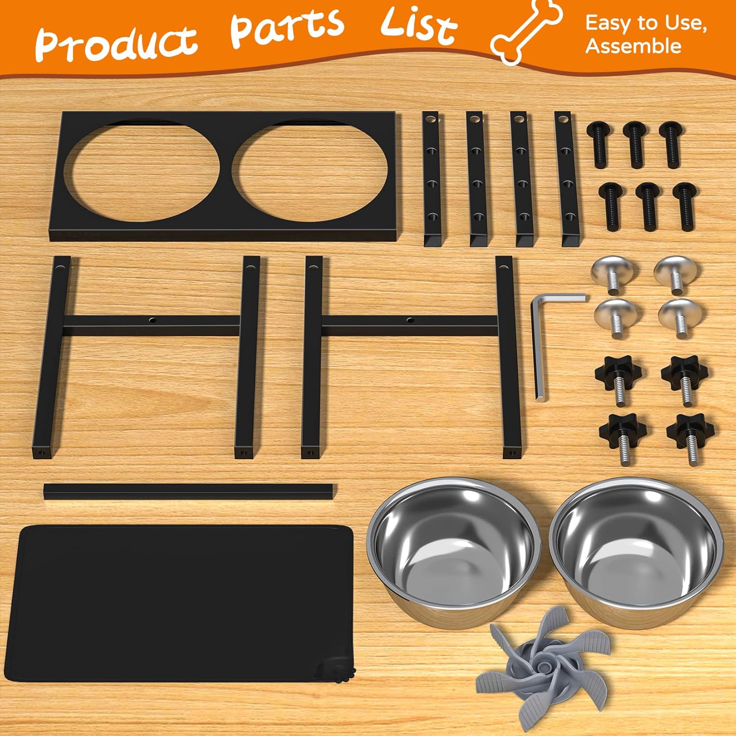 PACKAGE LIST Elevated Dog Bowls Bracket X 1 Stainless Steel Bowl X 2 Slow Feeder X 1 Elevated Dog Bowls Silicone Mat X 1 L-Shaped Tool X 1 Manual X 1