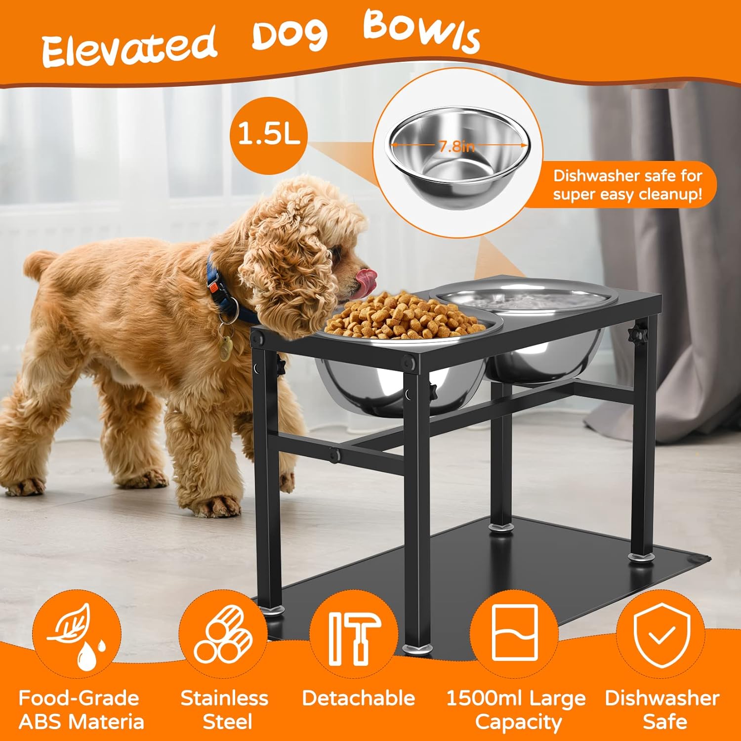 【TWO STAINLESS STEEL DOG BOWLS】The raised dog food bowl consists of two 1.5L detachable stainless steel bowls and raised dog bowl holder, food grade silicone placemat. The extra thick stainless steel bowl is dishwasher safe, making it super easy to clean.