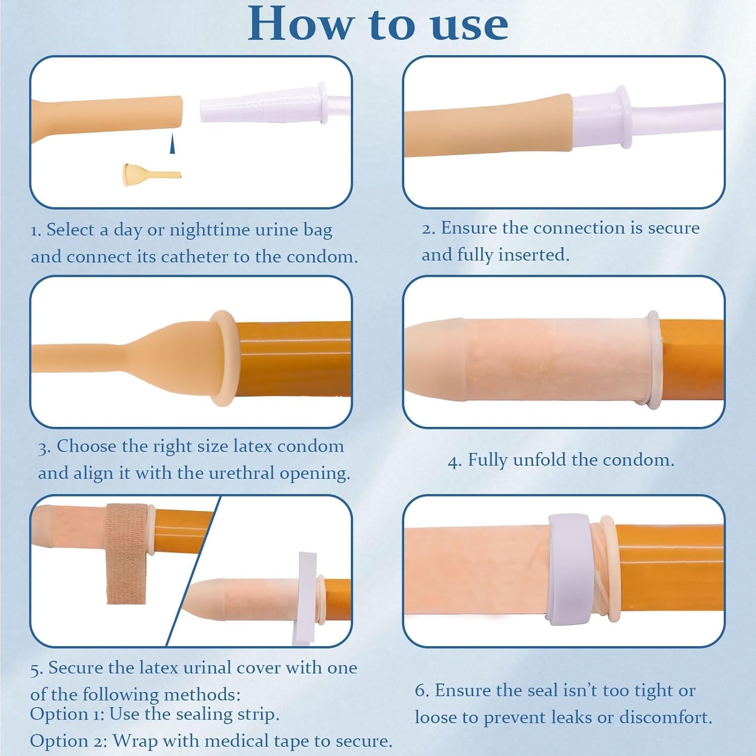 Effortless Incontinence Solution: Stay confident with 24 latex condom units and versatile urine bags. Ideal for daytime errands or nighttime rest, this set offers worry-free incontinence management without irritation