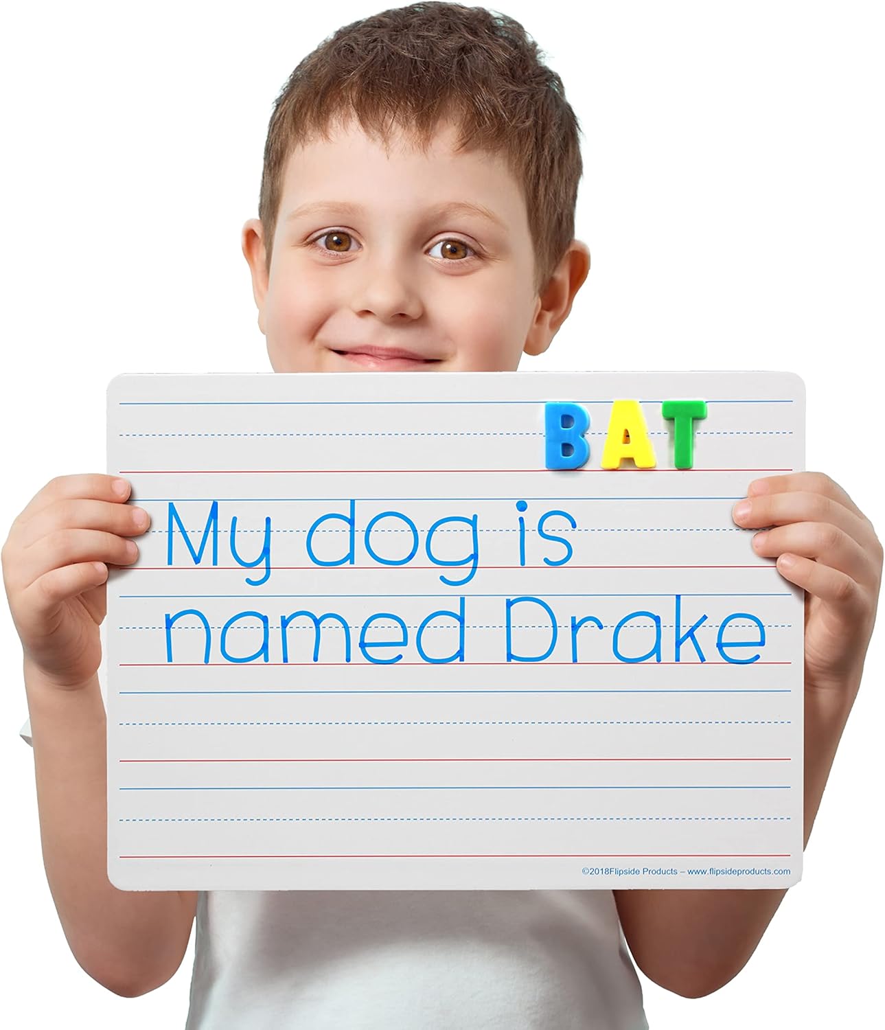 The class pack of magnetic 9″ x 12″ red and blue ruled two-sided dry erase board serves as an excellent tool for learning to write, providing several benefits. The red and blue lines on one side help learners develop proper letter sizing and spacing, reinforcing fundamental writing skills. The dual-colored lines can assist in distinguishing between different writing zones, promoting better organization. The blank backside allows for free-form practice, fostering creativity and flexibility in writing exercises. Additionally, the dry erase feature facilitates repetitive practice, making it an eco-friendly and reusable resource for honing handwriting skills. In addition to its writing benefits, the magnetic feature allows for the attachment of visual aids, such as letters, numbers, or other educational magnets, enhancing interactive learning experiences. This versatility makes the board an engaging tool for teaching various subjects, including math and language skills. The combination of ruled lines and magnetic capabilities makes it a multifaceted learning aid that promotes both structured writing practice and interactive, hands-on learning. 12 Pack.