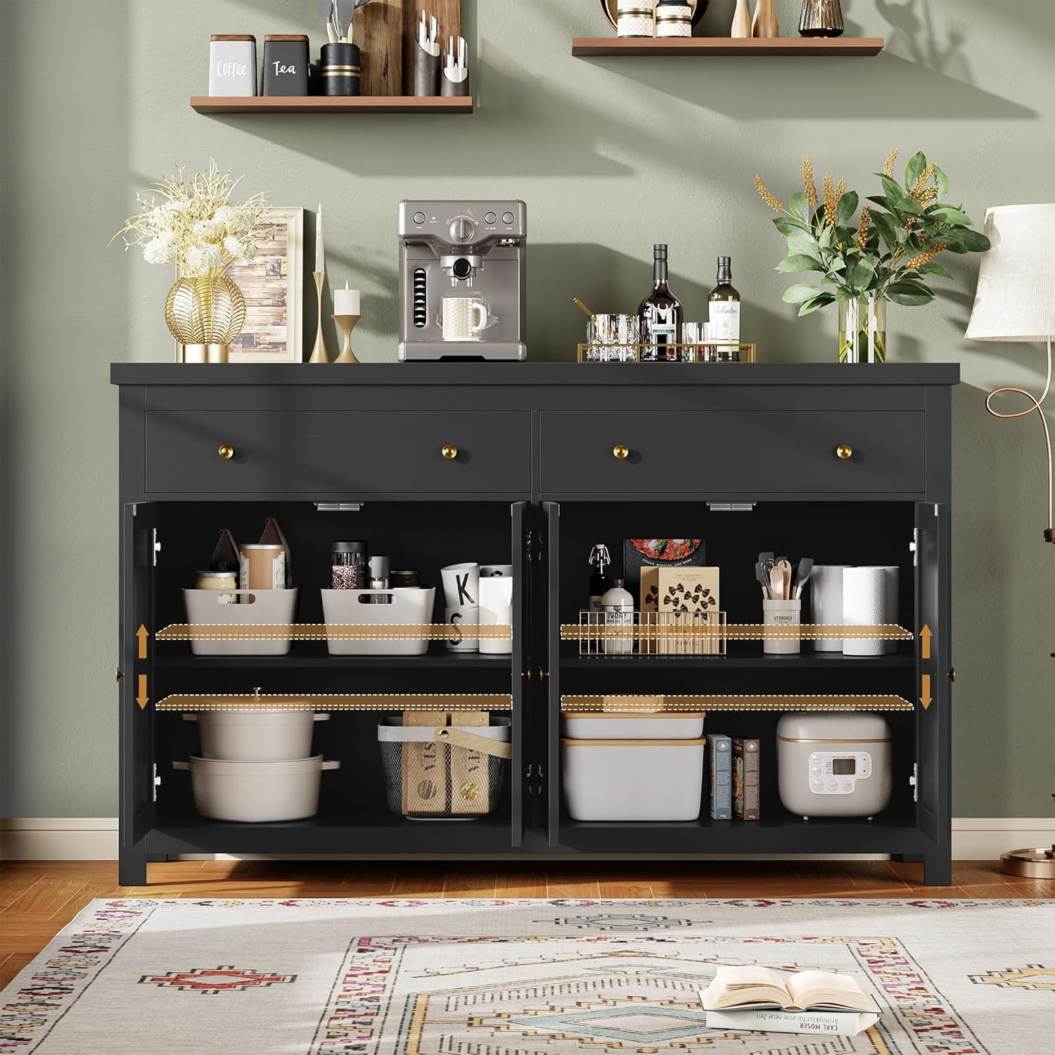 FOTOSOK Sideboard Buffet Cabinet with Storage, 55″ Large Kitchen Storage Cabinet with 2 Drawers and 4 Doors, Wood Coffee Bar Buffet Table for Kitchen Dining Room, Black