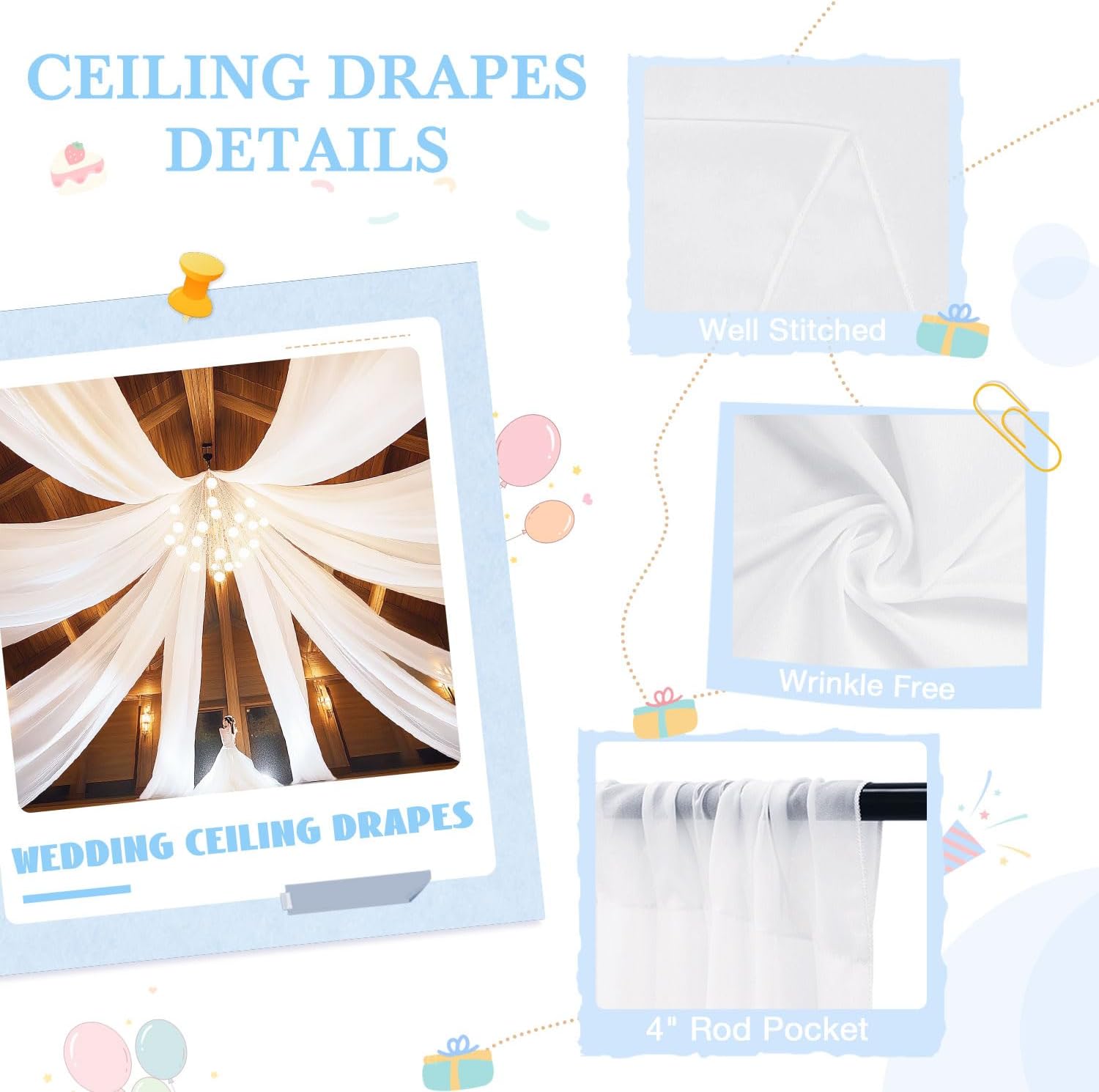 ✿【Ceiling Drapes & Hanging Kit Included】Package includes 6 panels 5ftx10ft white ceiling drapes and a robust hanging kit. Upgrade your decor with our ceiling drapes and hanging kit – the perfect solution for stunning, effortless event styling!