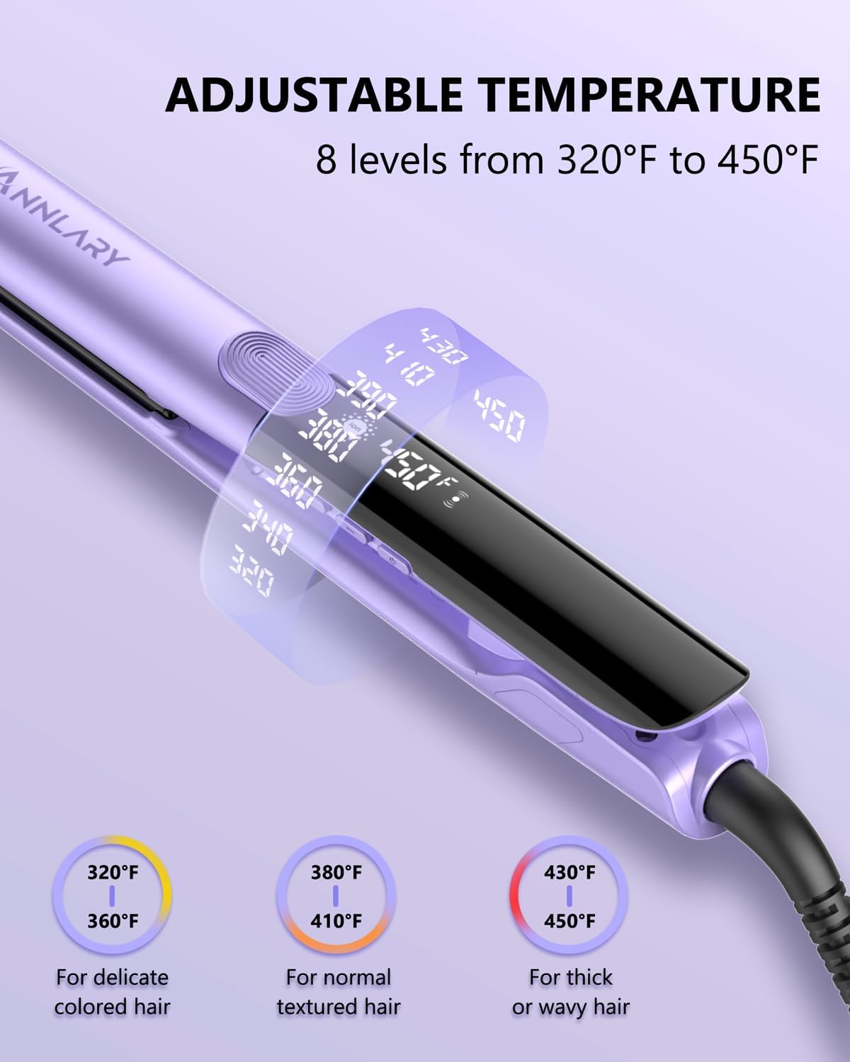 Adjustable Temperature for All Hair Types: With an adjustable temperature range from 320℉ to 450℉ and an easy-to-read LED display, this flat iron caters to all hair types and lengths. 8 precise heat settings ensure safe and effective styling without damage, tailored to your specific hair needs.