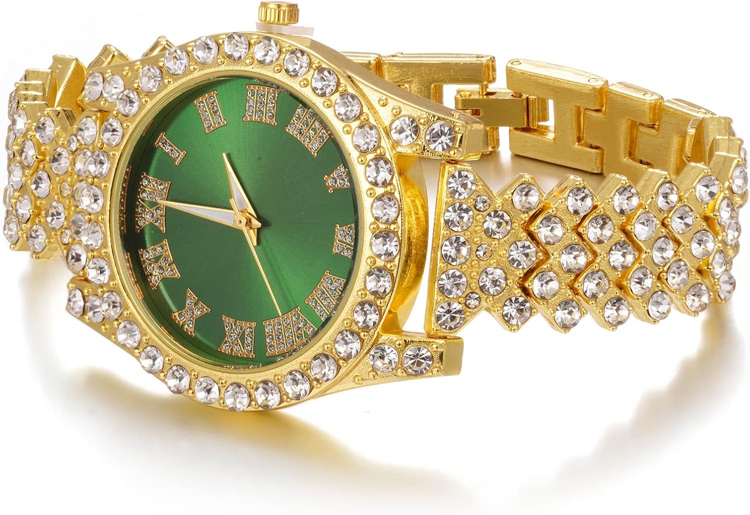 Halukakah Diamonds Gold Watch Iced Out, Kid’s 18K Real Gold/Platinum White Gold Plated 36MM Width Green/Blue/Red Dial Quartz Wristband 8″ with Cuban Link Chain 7″+16″ Bracelet, Free Giftbox
