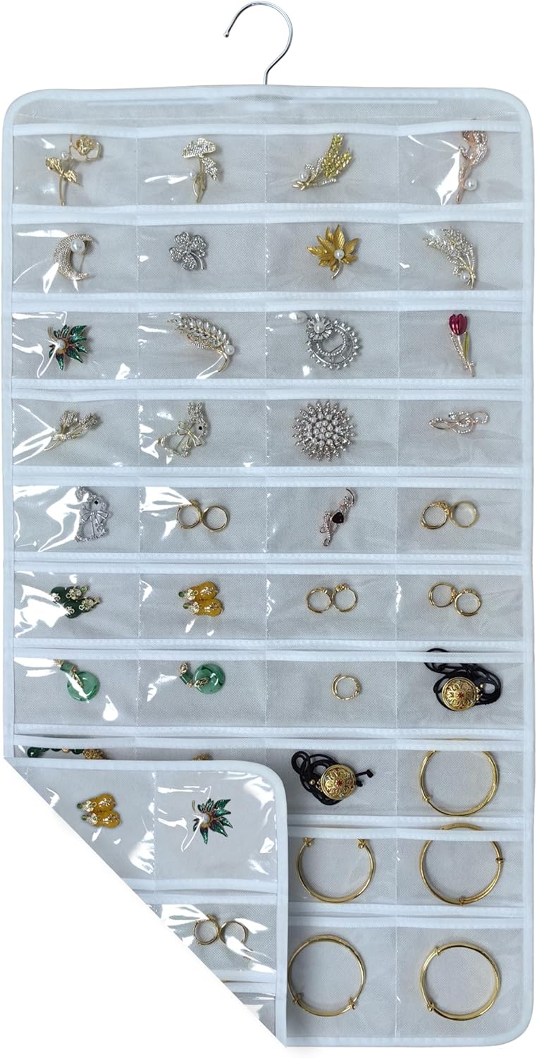 Large Storage Capacity—Double-sided hanging jewelry organizer has plenty of space to store jewelry. It’s designed with 80 transparent pockets to hold your rings, earrings, bracelets, watches, hairpins or other jewelry. It is perfect for your jewelry collections.