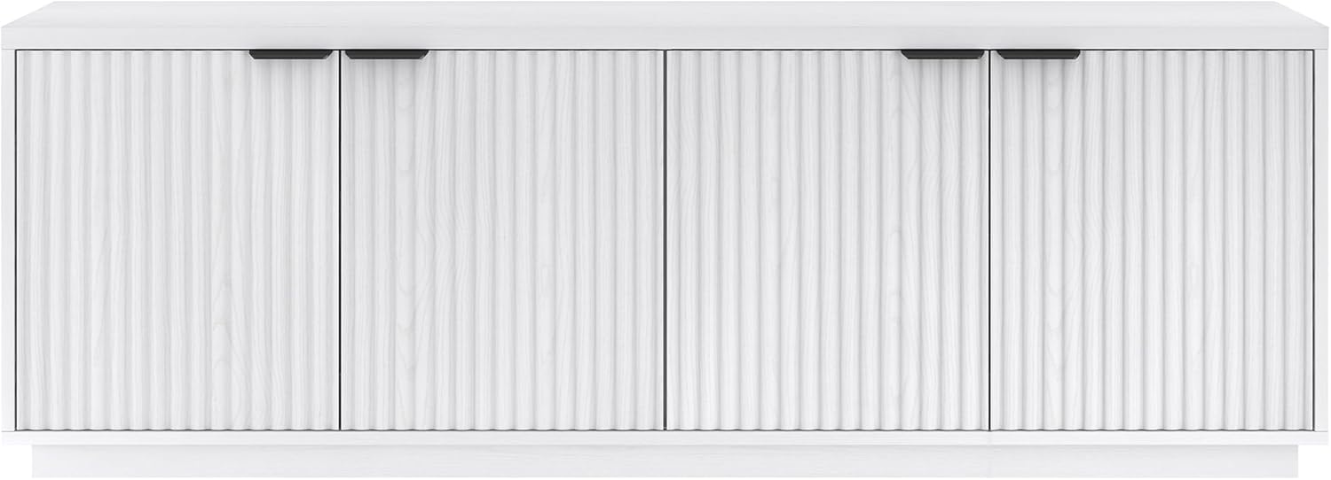 On-trend texture and design combine in this transitional TV stand. With a wood grain finish and textured fluting, this piece is sure to be a statement in your living room, den, or game room. The plinth base gives an illusion of a seamless transition from your floor, while the rounded front corners create a softer modern shape. The console features 4 fully enclosed doors with 4 inner shelves, allowing for ample storage for your devices, games, books, and more.