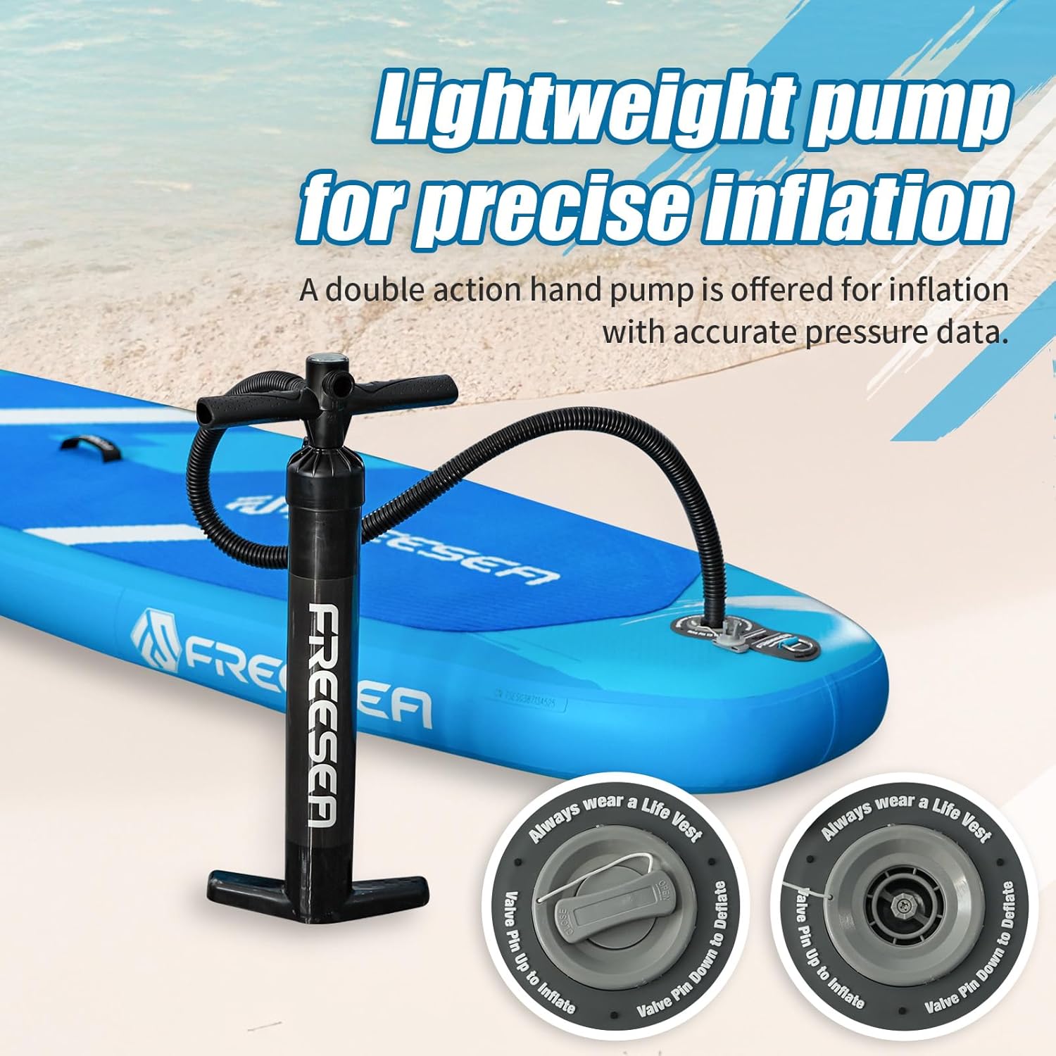 ABOUT THE INFLATABLE PUMP – The pressure gauge on the Freesea paddleboard pump has been carefully calibrated by our in-house engineers to accurately display air pressure values. Please note, however, that when the gauge does not sense enough air pressure, it will not display any numbers. In this case, please continue to inflate your paddleboard until the gauge begins to display a value.